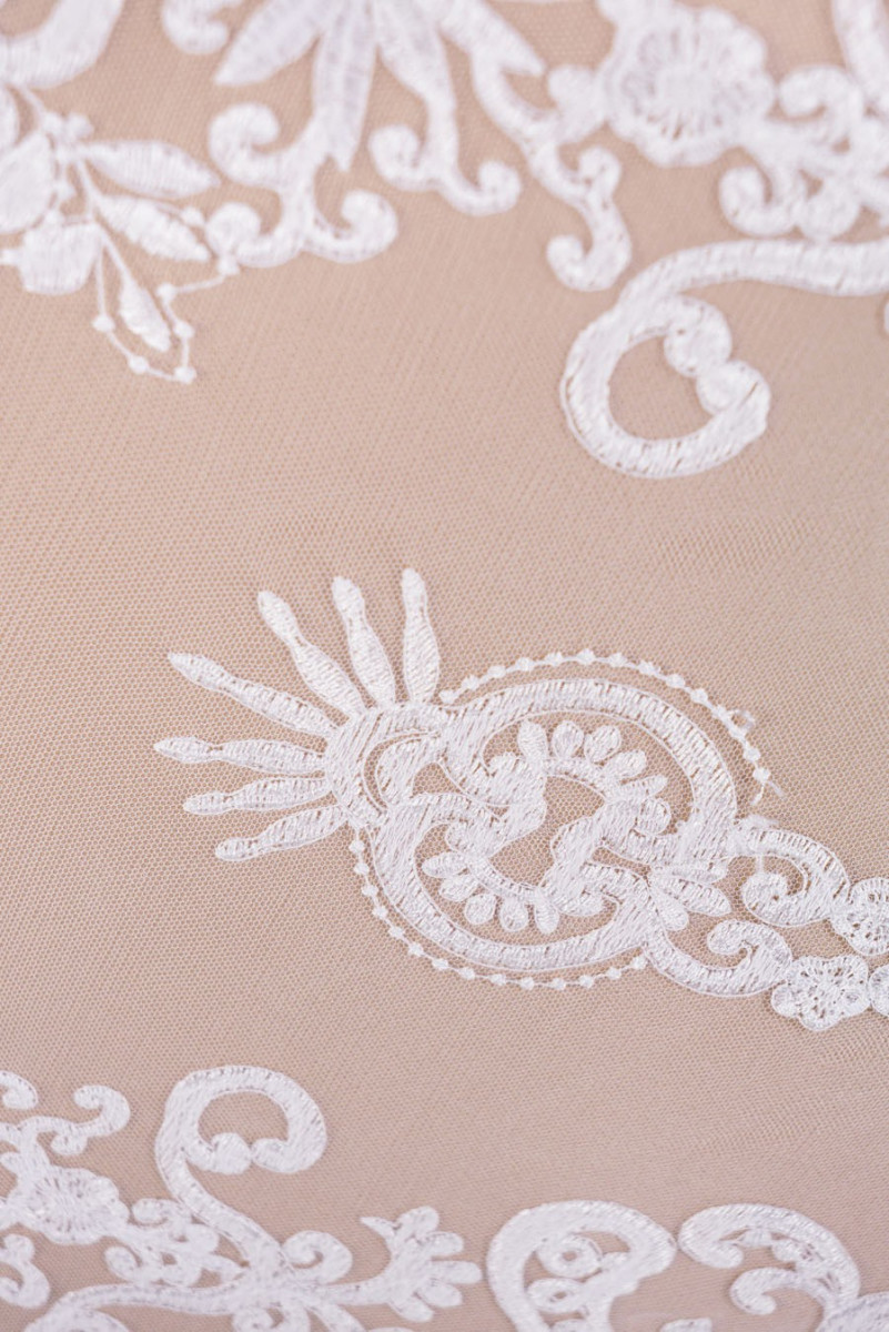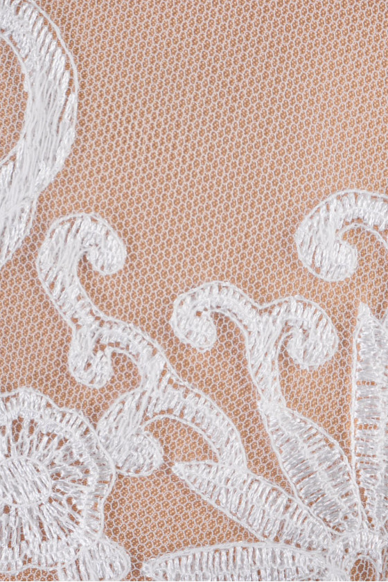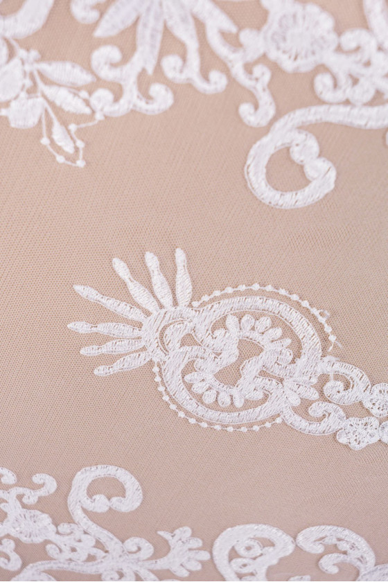 Itaalia pits kreemikas värvi. Ilus idamaiste mustrite motiiv 25 cm laiuste vertikaalsete paneelide kujul, mis on ühendatud väiksema elemendiga (8 cm), mustri kõrgus on 135 cm. Kangas on viimistletud ühelt poolt hambaga - õmbleme selle ringikujuliselt. Ideaalne pulma- ja õhturõivaste õmblemiseks.