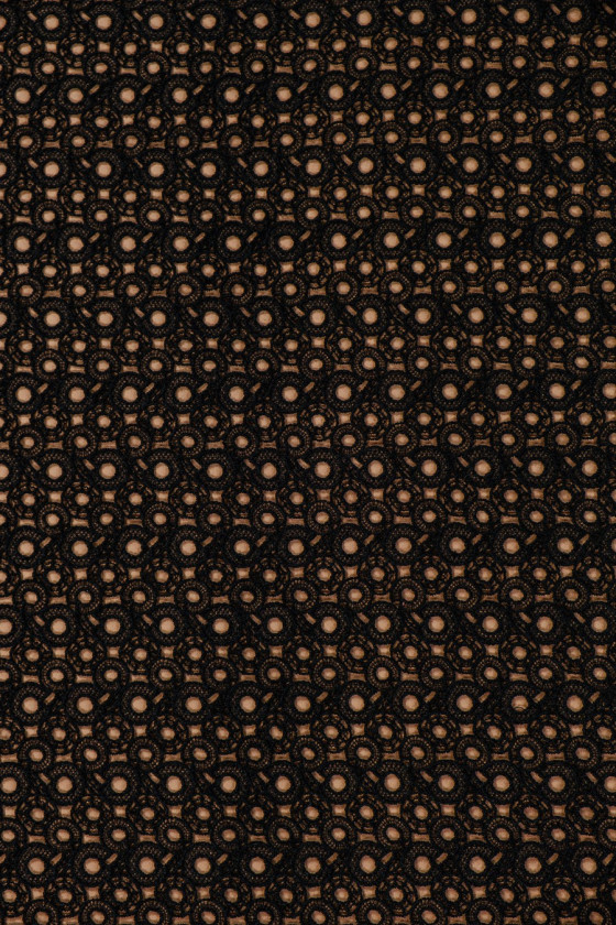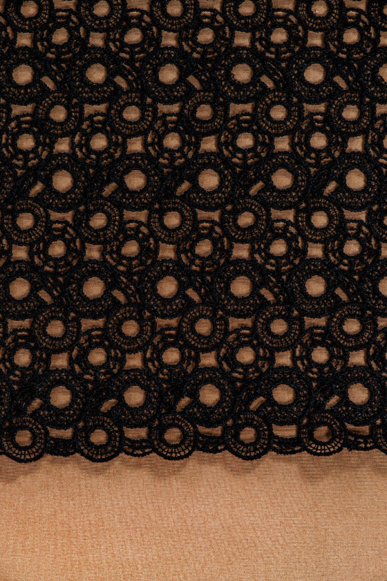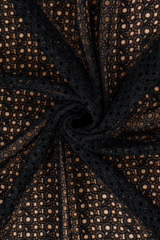 Itaalia guipure pits mustas ringikujulise motiiviga. Kangas on 90 cm lai. Ideaalne elegantse pluusi, seeliku või kleidi õmblemiseks.