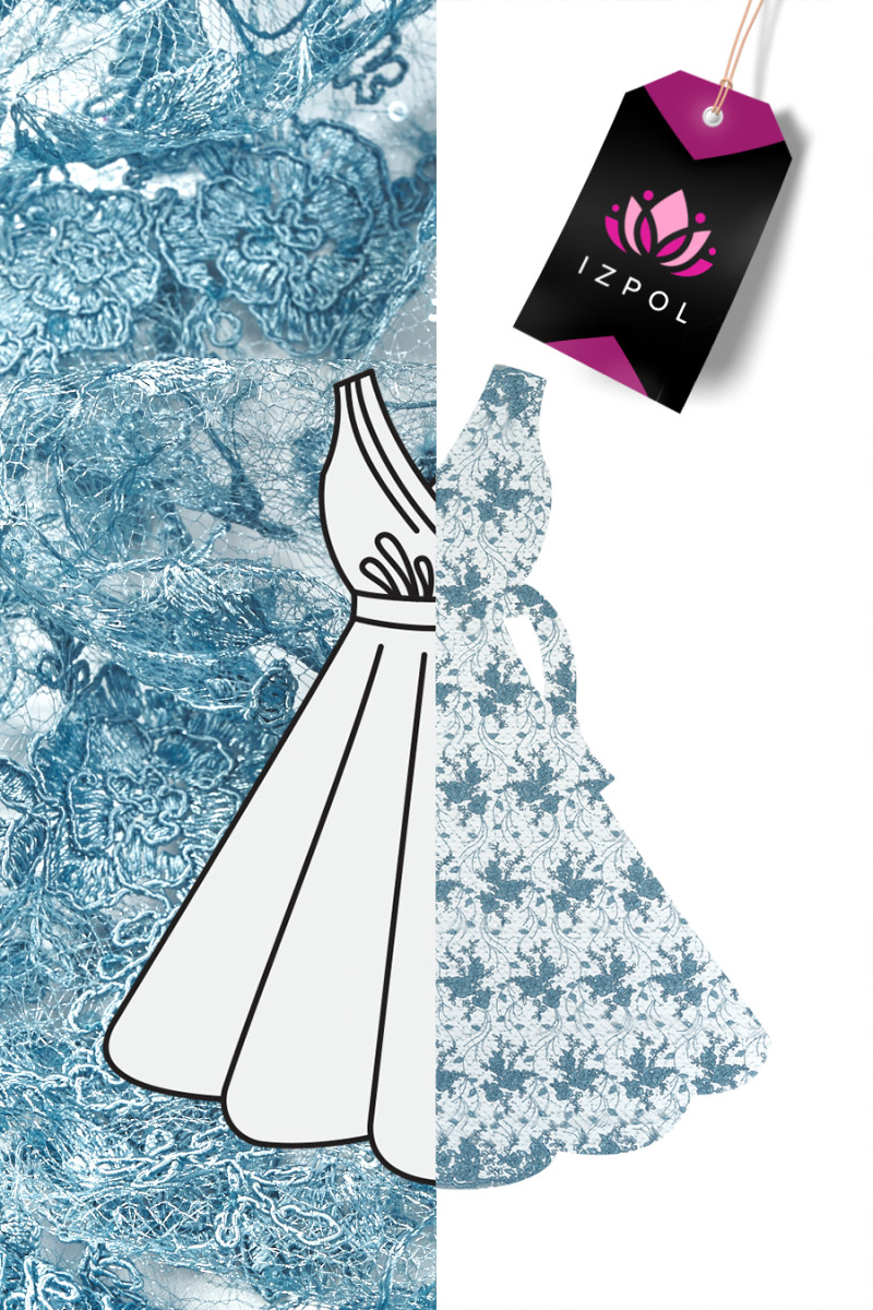 Itaalia pits sinine ja hall tiheda lillemotiiviga, peenelt kaunistatud väikeste litritega, mis muudavad kauni sädeluse. Kangas on valmistatud võrgust, mis meenutab ämblikuvõrku, mis on mõlemalt poolt viimistletud dekoratiivse hambaga - õmbleme selle ringikujuliselt.