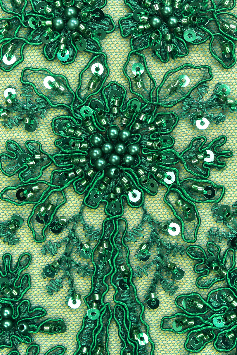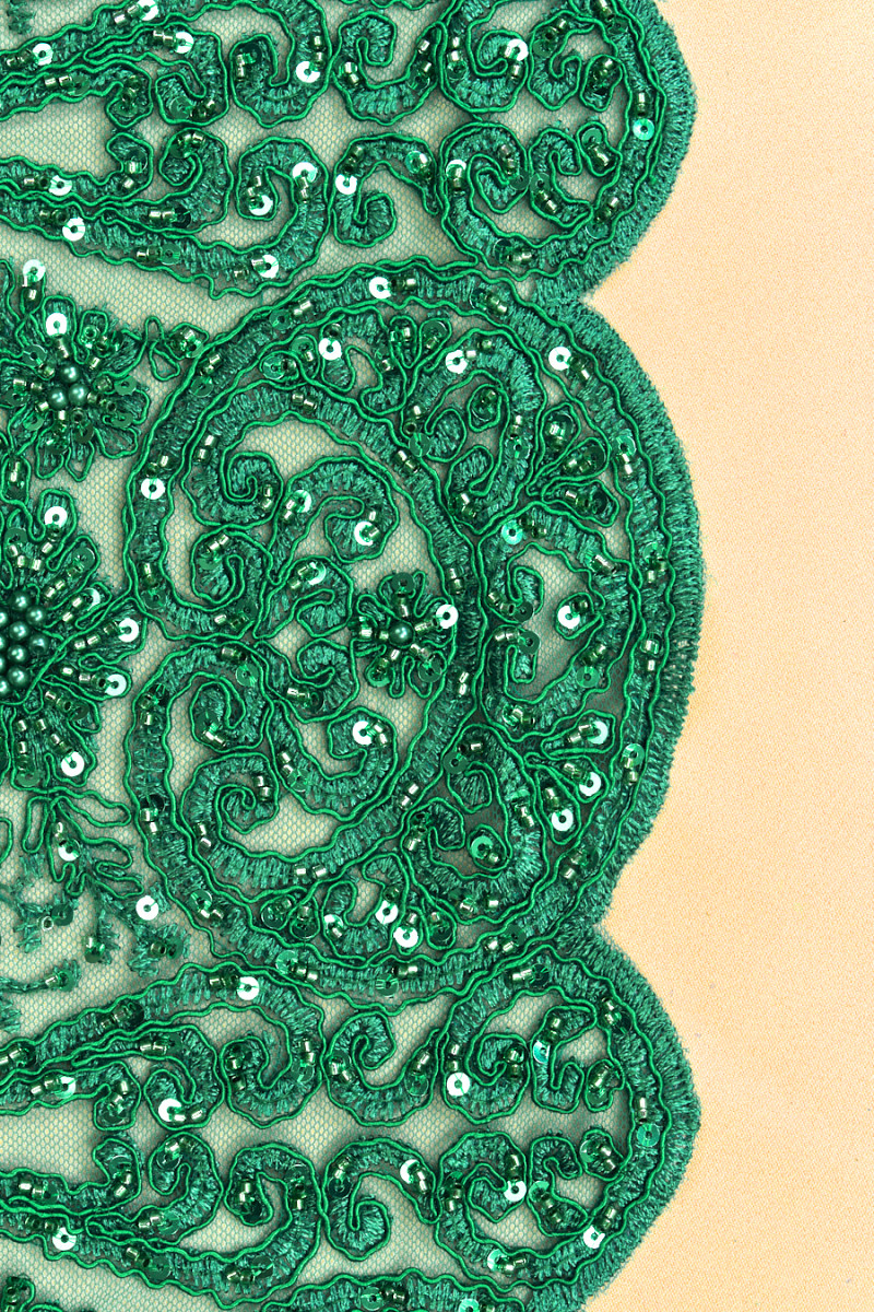 Itaalia pitsist õhtukangas rohelises, valmistatud tüllist sama värvi ühtlaselt tikitud lillemotiividega suurusega 10 cm * 20 cm. See on rikkalikult kaunistatud roheliste litrite, helmeste ja pärlitega ning kaunistatud rohelise nööriga, mis muudab mustri veidi kumeraks. Kanga servad on viimistletud laia dekoratiivse hambaga - õmbleme selle ringikujuliselt.