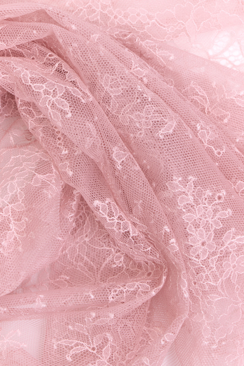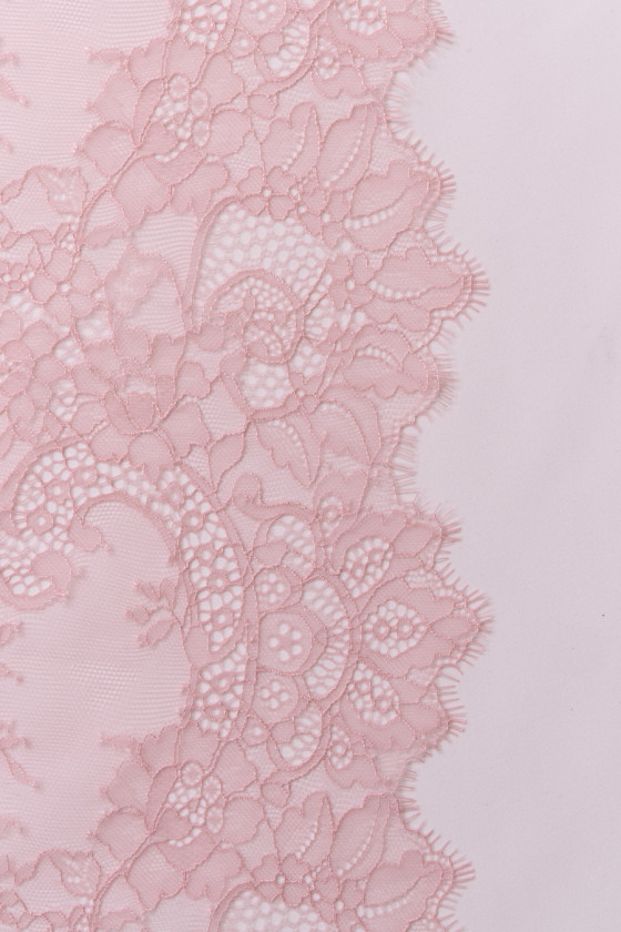 Itaalia, õrn prantsuse pits määrdunud roosas. Kroon on pehme, läbipaistev, meeldiv puudutada, viimistletud mõlemalt poolt dekoratiivse hambaga, paindumatu, kuid töötab õrnalt hambaniidil ja sobib kenasti. Soovitame seda pluuside, sisetükkide ja elegantse aluspesu jaoks.