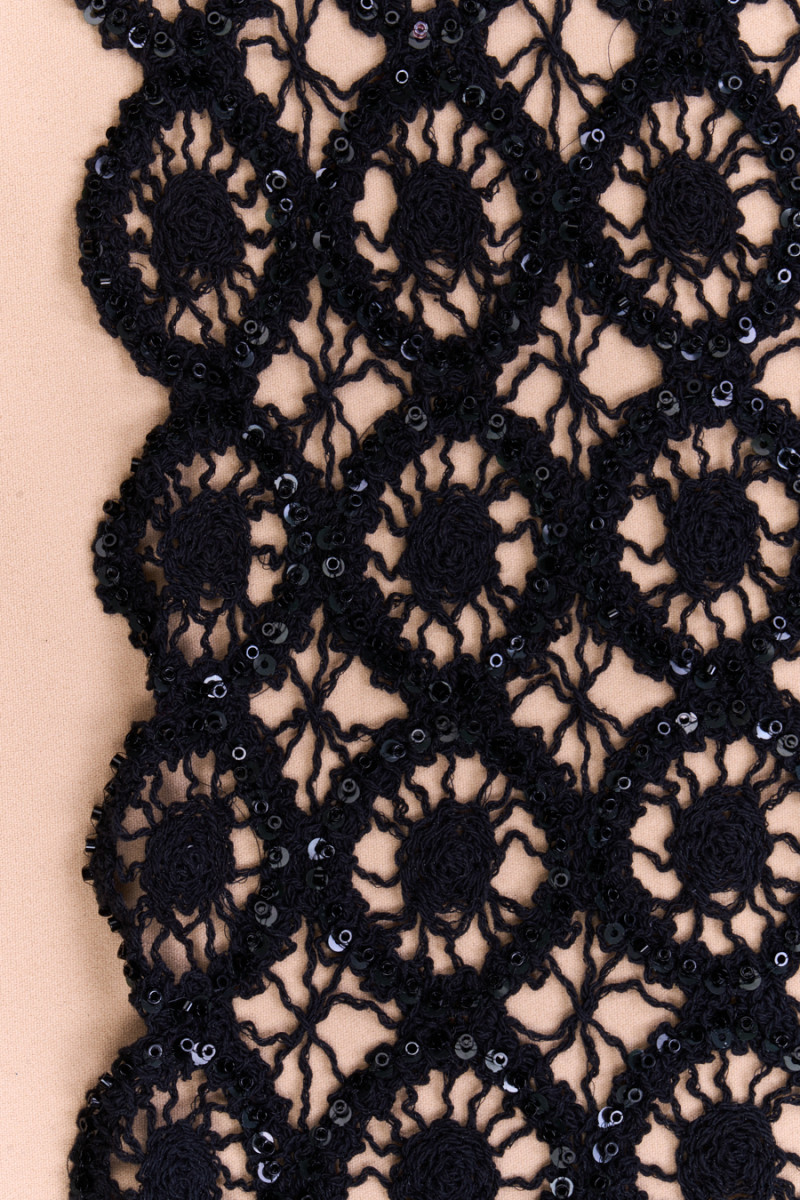 Itaalia pits, mille ažuurne muster on must, kaunistatud mustade helmeste ja litritega. Kangas on pehme, läbipaistev, mitteelastne ja tänu kasutatud helmestele on õrn sära. Fantastilist pitsi, millel on palju kasutusvõimalusi, saab kasutada kleitide, pluuside, seelikute, topside loomiseks ja ka viimistluseks.
