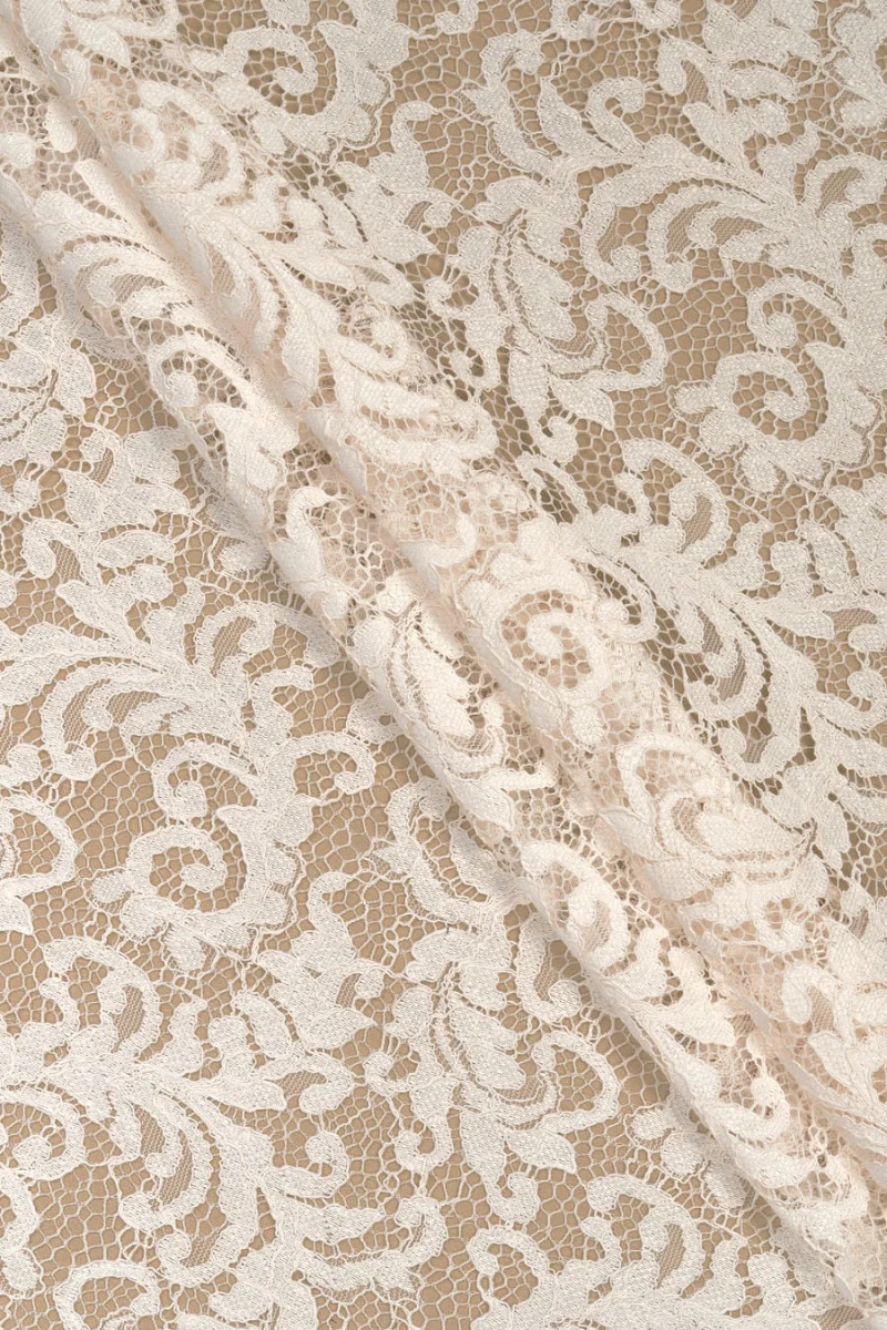 Itaalia pits kreemikas toonis. Kangal on tihe lillemotiiv, mis on ühendatud võrguga ja viimistletud kordoniga. Kroon mõlemal küljel on viimistletud dekoratiivse hambaga – me õmbleme selle ümbermõõtu. See on pehme, läbipaistev ja paindumatu. Väga kena ettepanek, millest saab luua kleite, seelikuid, pluuse või pühadelühikesi pükse.