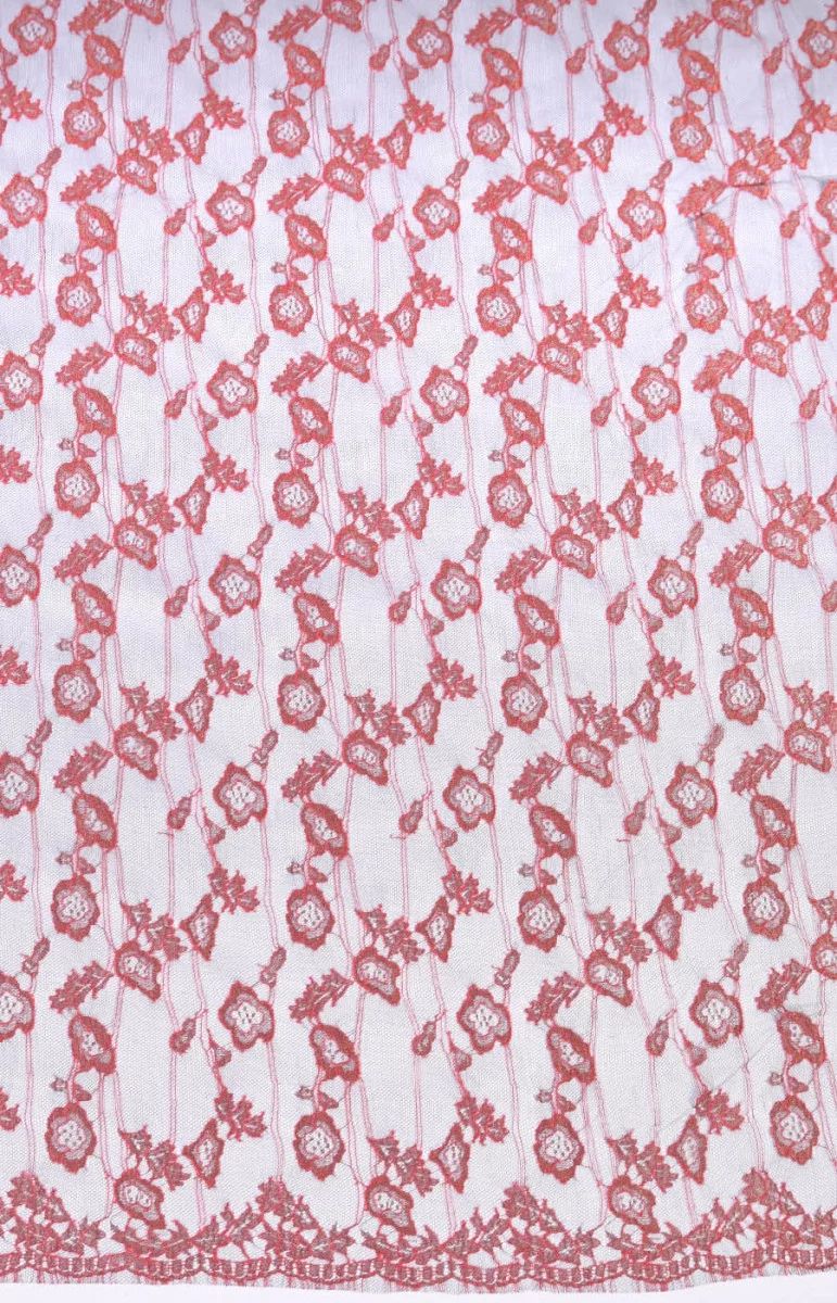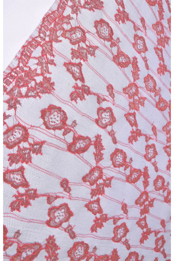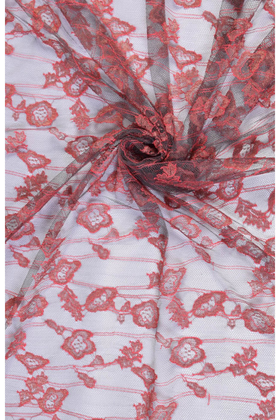 Õhuke, õrn pits heledas burgundias ja roosa mustas tüllis. Lõpetatud hambaga mõlemalt poolt. Õrn kangas. Ideaalne pluuside, kleitide jaoks.
