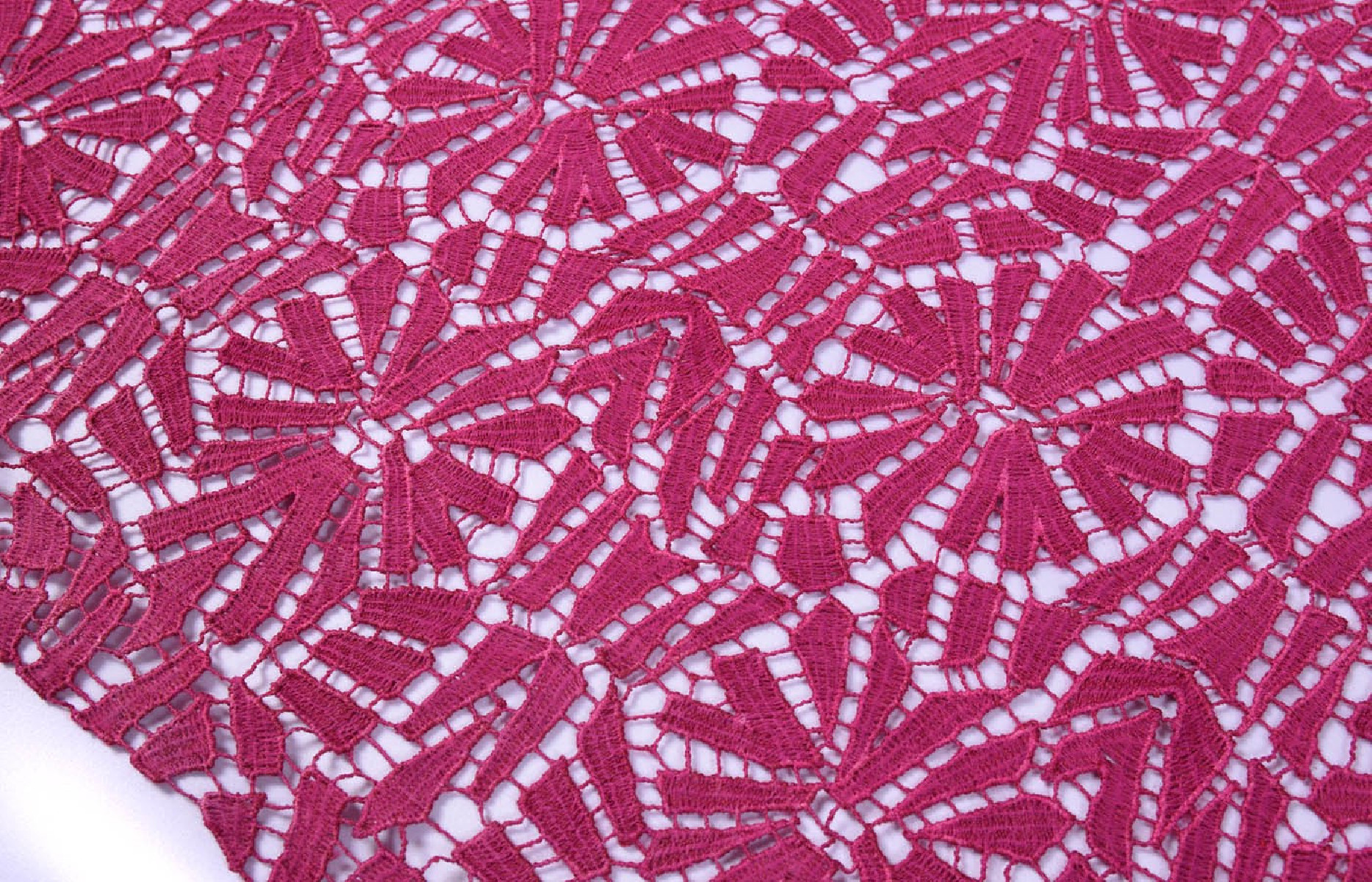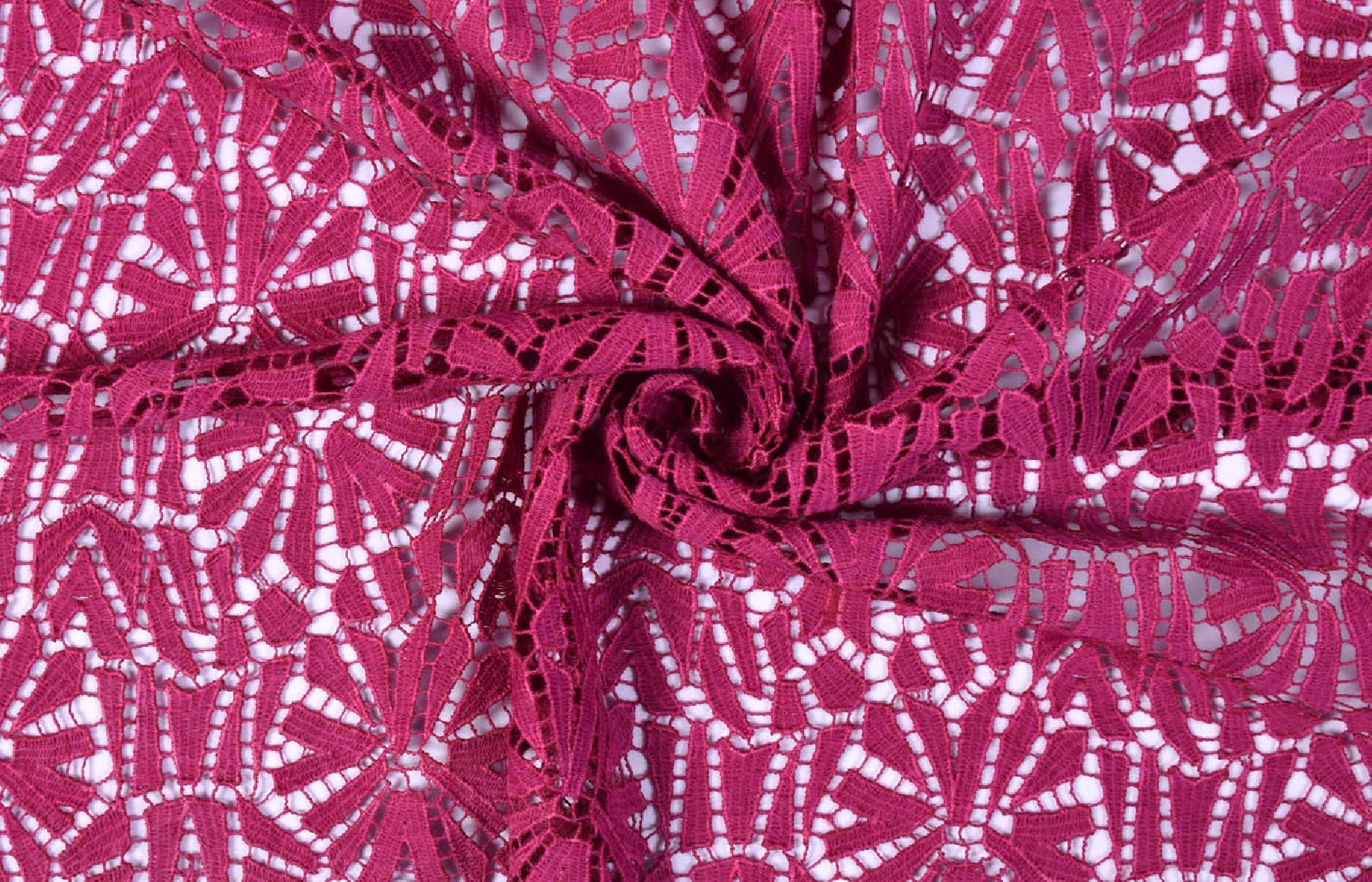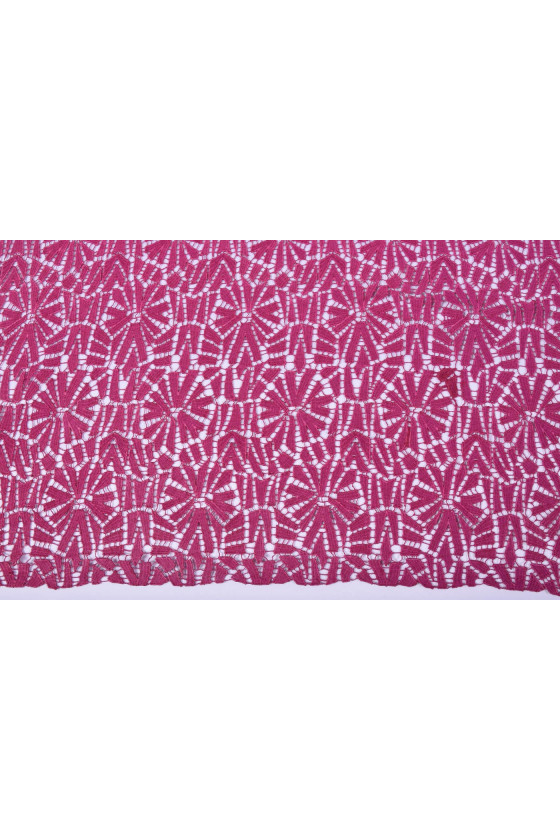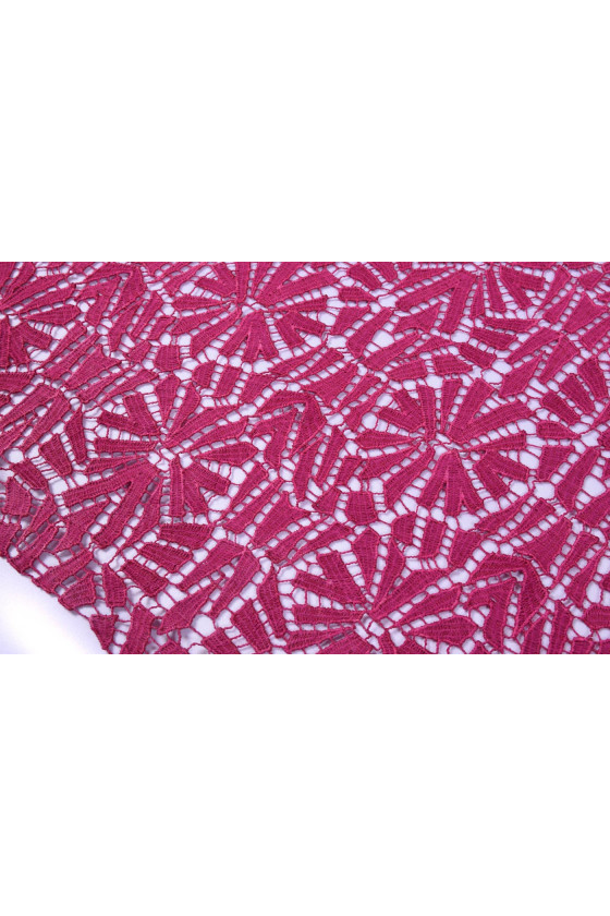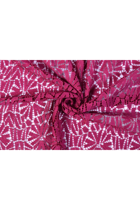 Itaalia guipure kangas amarandi värvi kupongides mõõtmetega 110 cm* 90 cm ja 70 cm* 90 cm. Ilus, tihe lillemuster, mis on ühendatud ämblikuvõrguga, on mõlemalt poolt kangas viimistletud väikese dekoratiivse hambaga. Kangas sobib ideaalselt inimestele, kellele meeldivad vaigistatud värvid. See sobib suurepäraselt elegantse kleidi, pluusi, seeliku õmblemiseks või viimistluseks teistele kangastele.