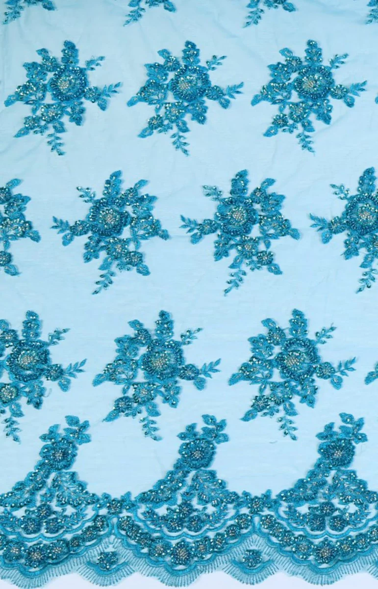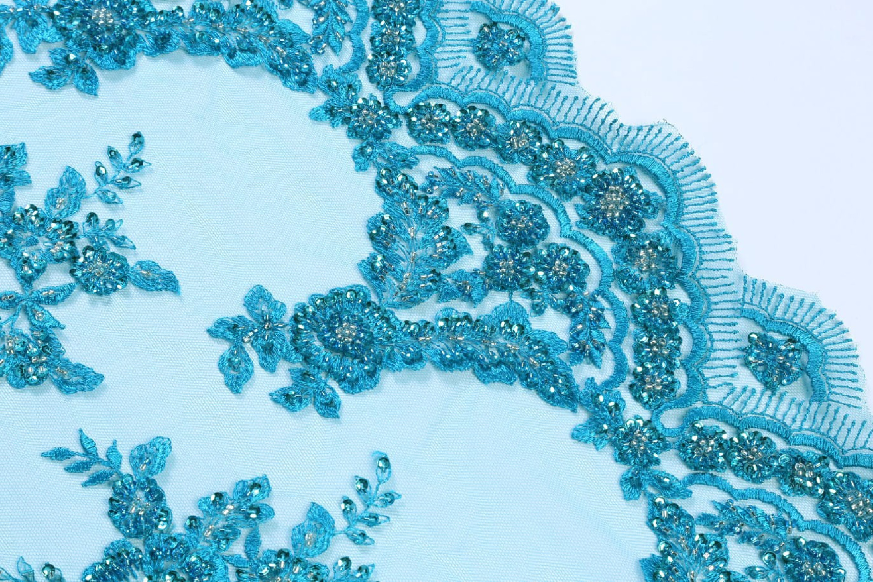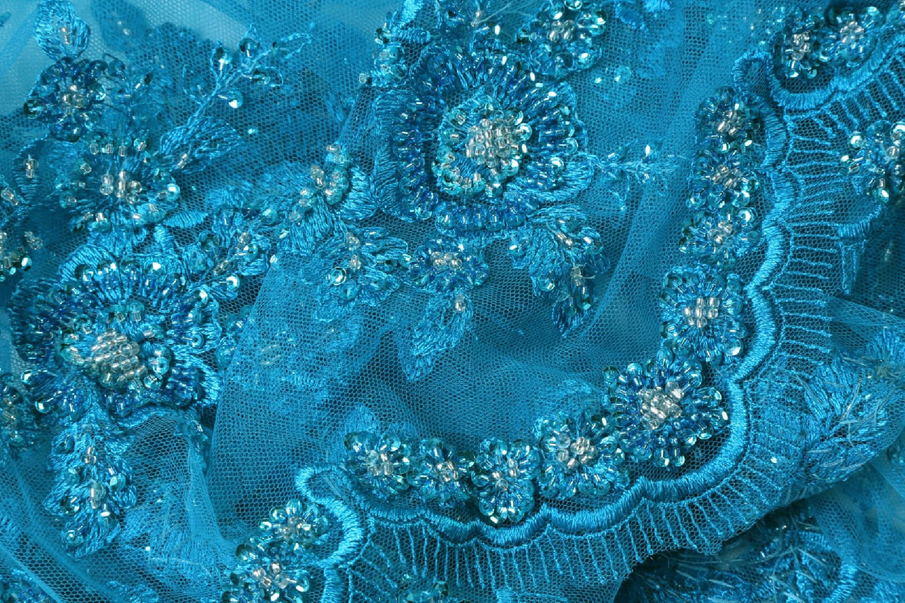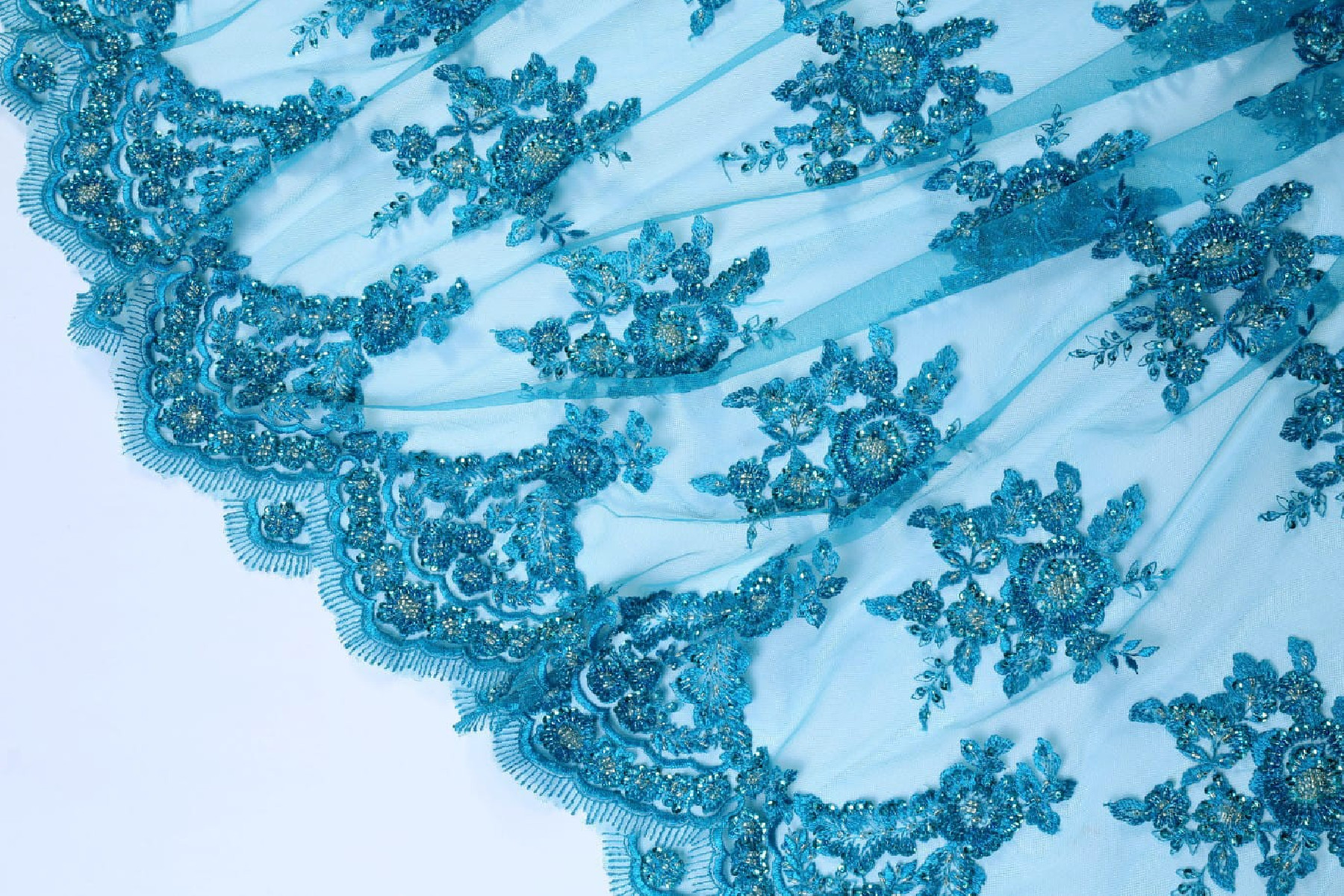 Ilus pits, mis on tikitud helmestega. Kangas on mitteelastne, raske, viimistletud mõlemalt poolt hambaga. Ideaalne kleitide või pluuside jaoks.