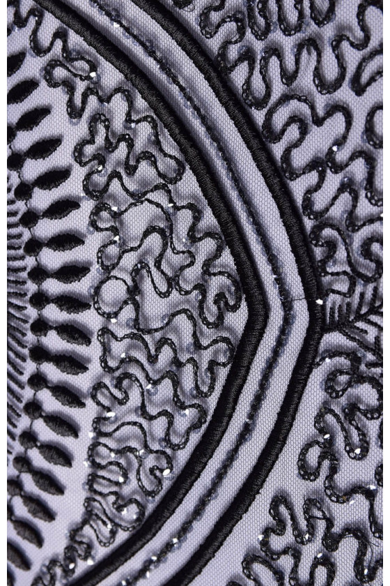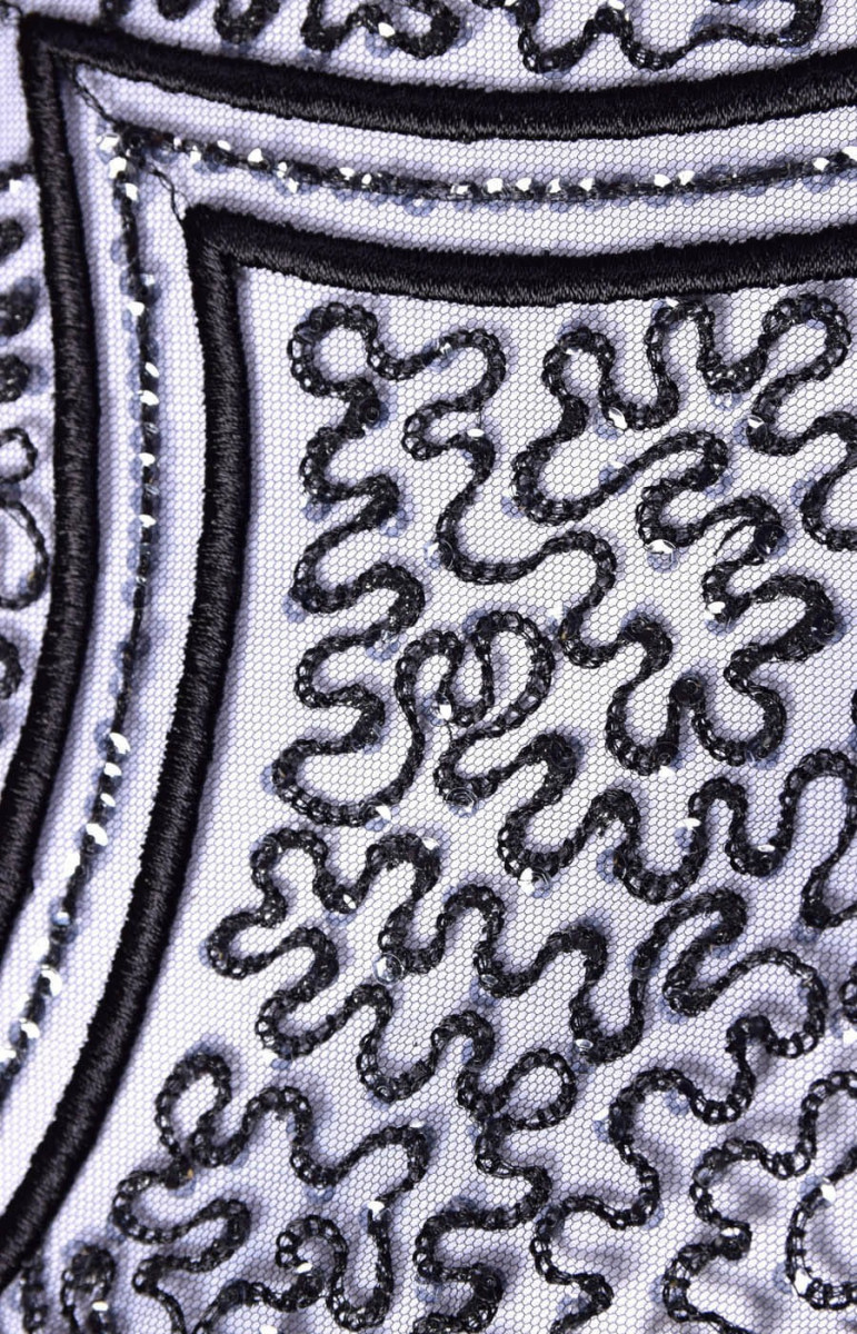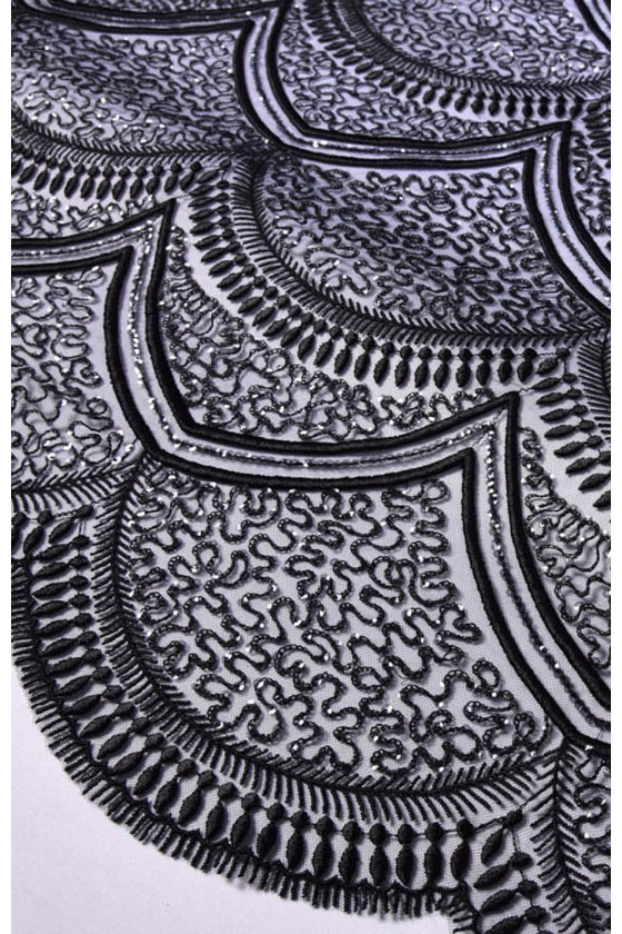 Ilus kroon, mille ühel küljel on hambaviimistlus. Hammas on umbes 20 cm lai. Tikitud helmeste ja litritega. Kangas sobib suurepäraselt õhtukleitide ja pluuside jaoks.