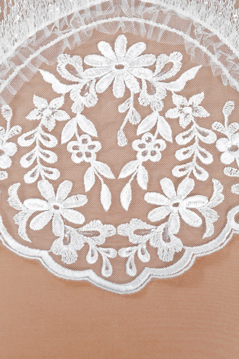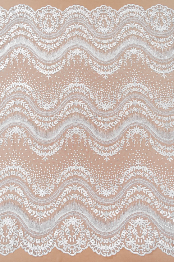 Ilus valkjas pulmapits, mis on viimistletud hambaga mõlemalt poolt. Hammas on umbes 15 cm lai. Tikitud helmeste ja litritega. Kangas sobib suurepäraselt pulmakleitide ja pluuside jaoks.