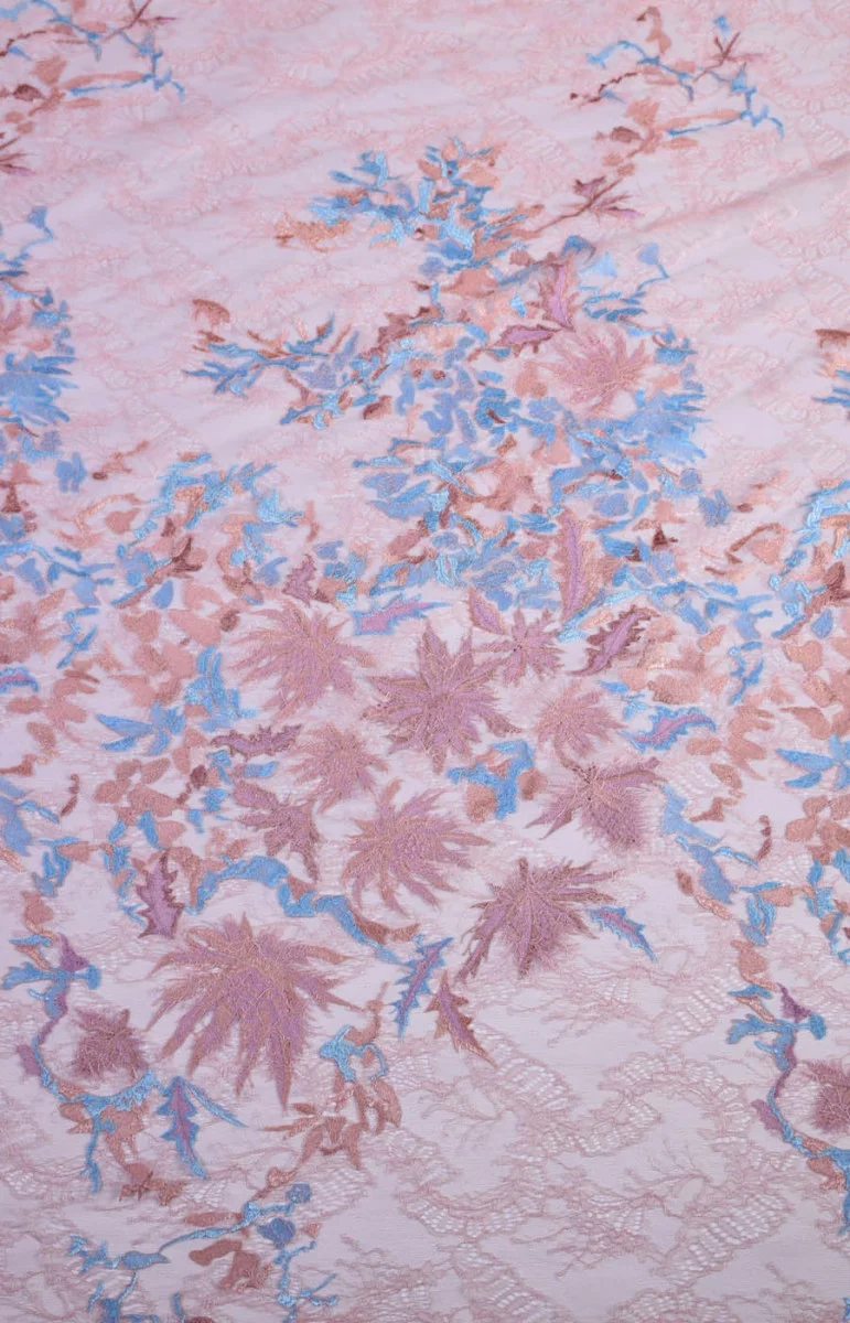 Kaunis pulberroosa ja sinine pits tikanditega, mis loovad 3D-efekti. Kangas 140 cm lai. See on pehme ja õrn. Ideaalne kleitide või pluuside jaoks.