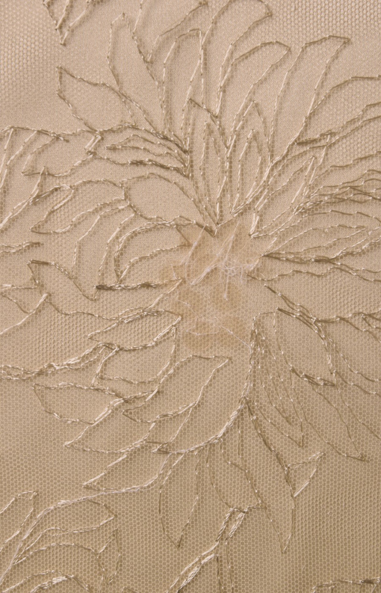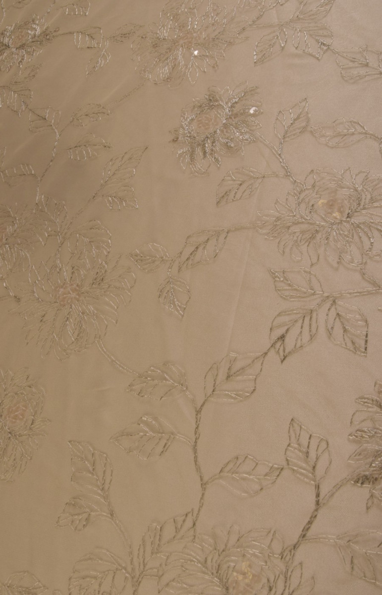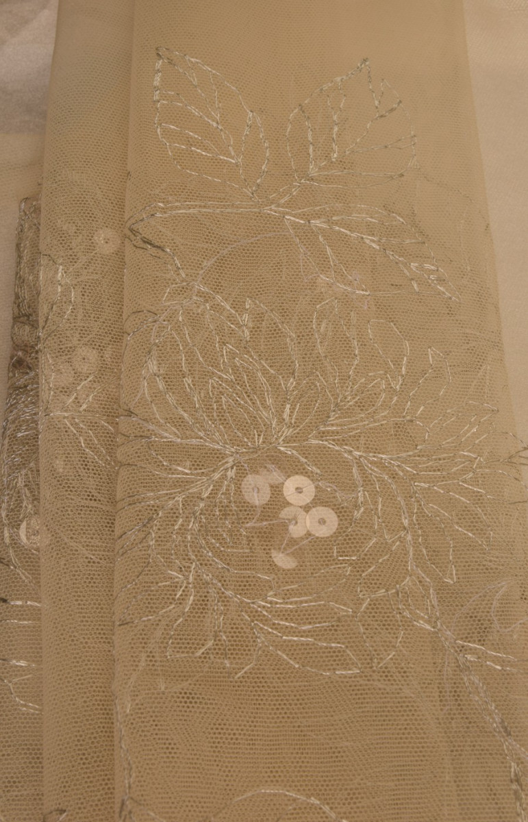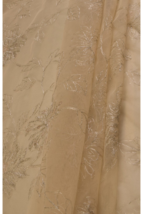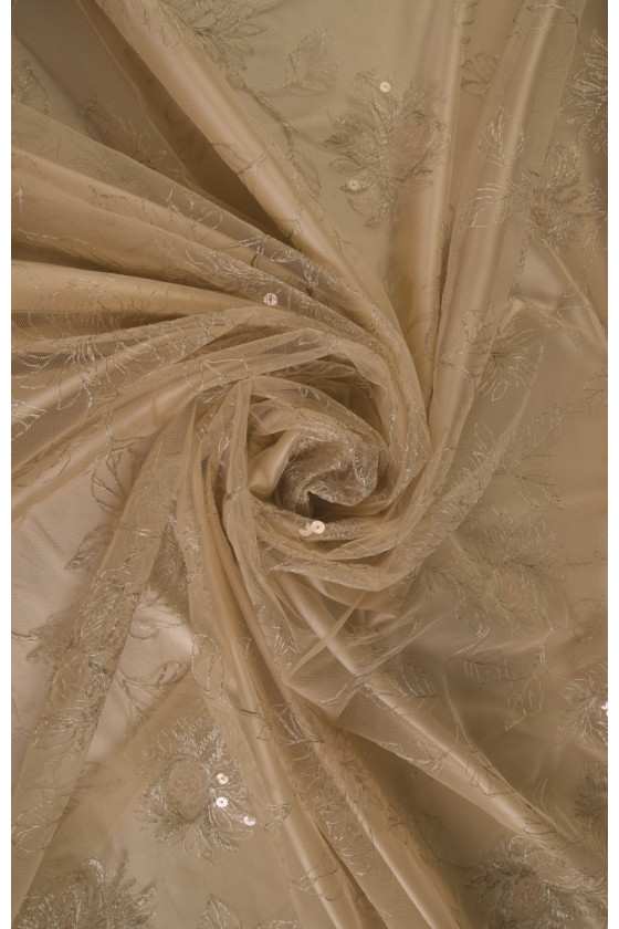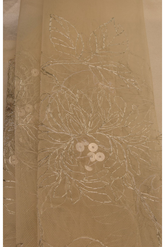 Beež pits, mis on tikitud suurte lillede õrna mustriga, millele on õmmeldud läbipaistvad litrid, tänu millele kangas särab diskreetselt. Struktuur on mõõdukalt jäik. Soovitame valida satiin voodriks.