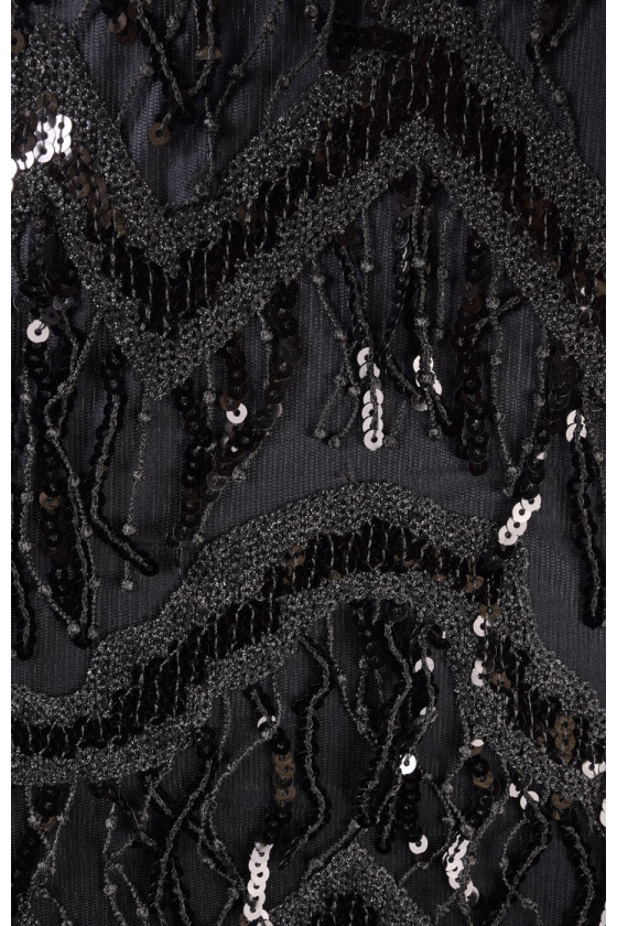 Tüll, mis on tikitud mustade narmastega litritega. Muster tekitab laineid ja siksakke. Soovitame seda elegantsete õhturõivaste õmblemiseks. Must siidist satiin sobib ideaalselt voodriks.
