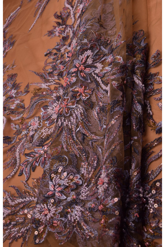 Pits, mis on tikitud kasvava mustriga pärlite ja litritega. Võimalus lõigata aplikatsioone (suurus umbes 30 cm) ja õmmelda teistele kangastele. Muster allosas on umbes 60 cm kõrge. Värvid: lilla /lilla/roosa muster alasti tüllil. Soovitame seda sobitada siidisatiiniga