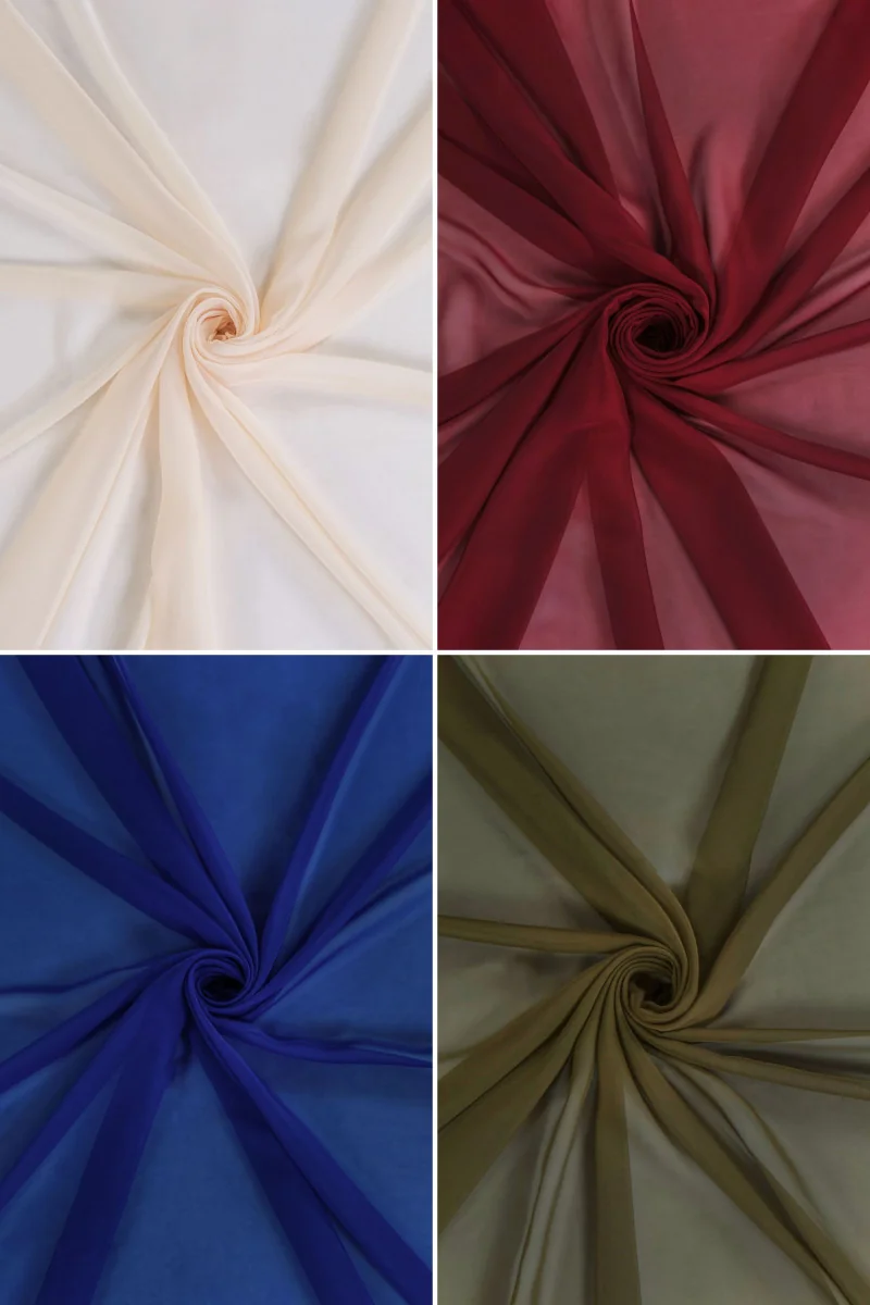 Polüesteršifoon on kerge, õhuline, pehme ja läbipaistev kangas. Ideaalne kleidi, pluusi, seeliku, rätiku õmblemiseks. Voodrina soovitame valida sama värvi satiin- või polüesterkrepp.