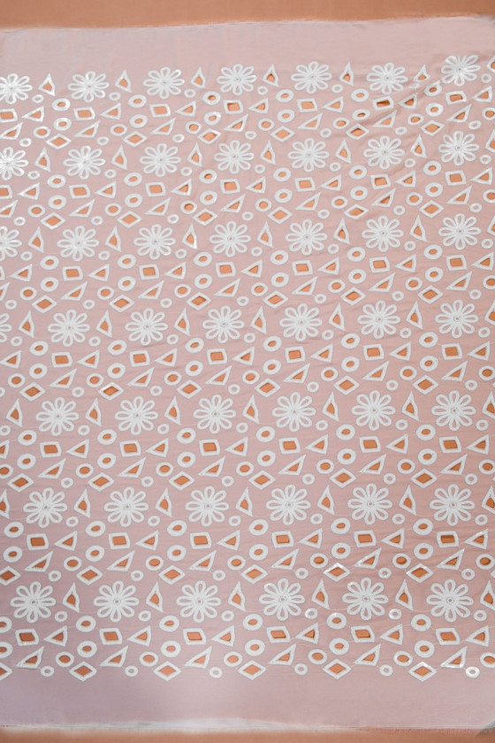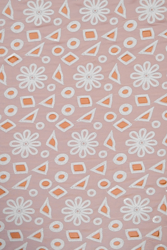 Itaalia polüester šifoon heleda beeži värviga. Laserlõigatud, geomeetriliste mustrite ja lillemotiiviga kangas, mis on kaunilt kaunistatud pärlivärvi litritega. Kerge, õhuline, läbipaistev kangas - ideaalne kleidi, seeliku või pluusi õmblemiseks.