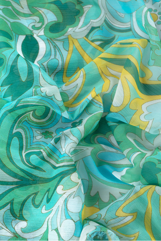 Itaalia polüester šifoon, mis on kortsutatud rohelise ja türkiissinise, väljamõeldud lille- ja lehemotiividega. Creased chiffon on õhuke, läbipaistev, õhuline, õrn kangas, millel on huvitav, kortsus struktuur.
