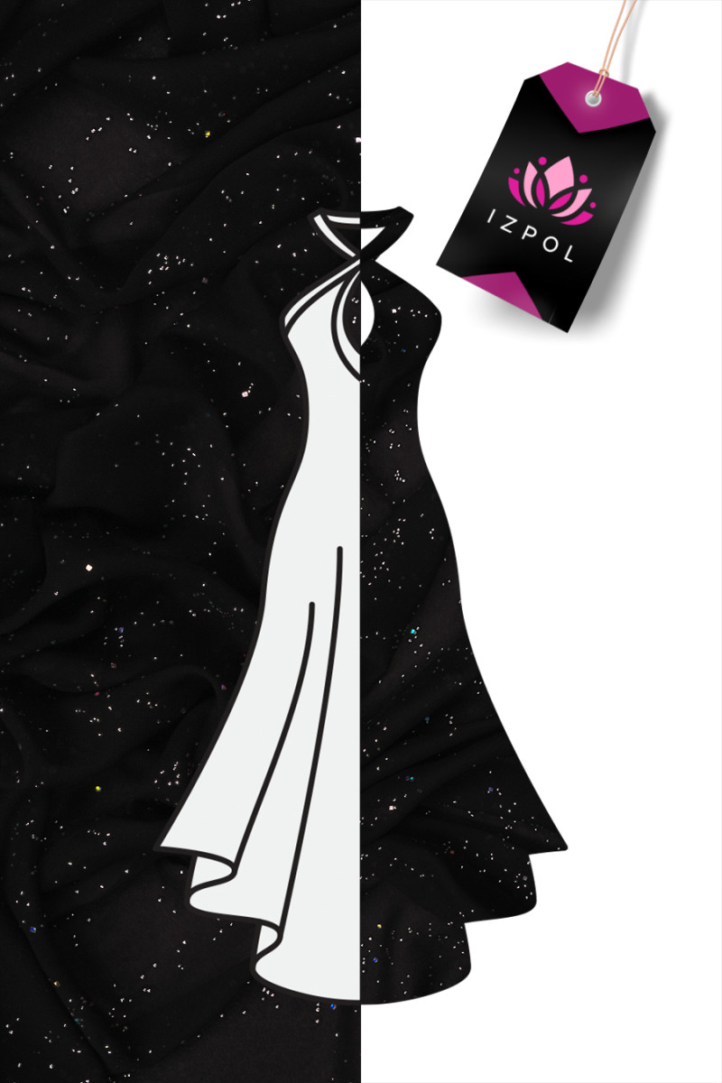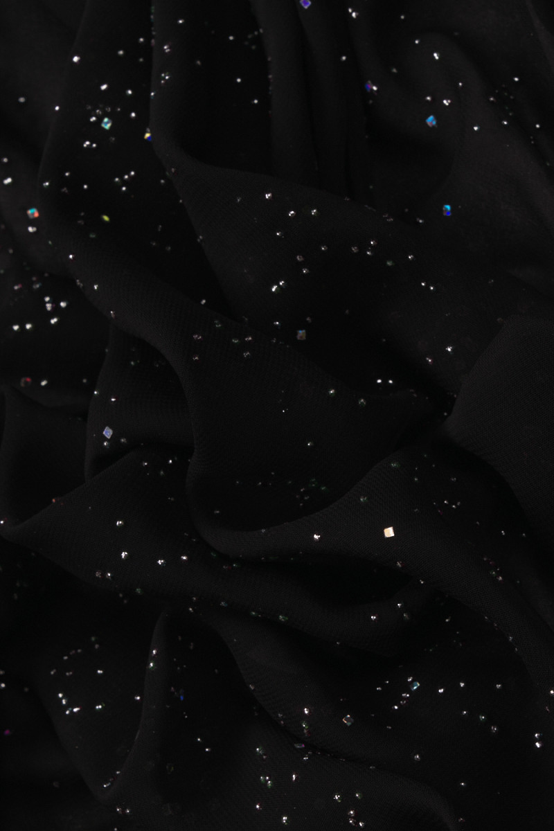 Itaalia polüester šifoon mustas värviliste väikeste kaunistustega. Õhuke, läbipaistev, pehme ja mitteelastne kangas - ideaalne kleidi, pluusi, seeliku või rätiku õmblemiseks.