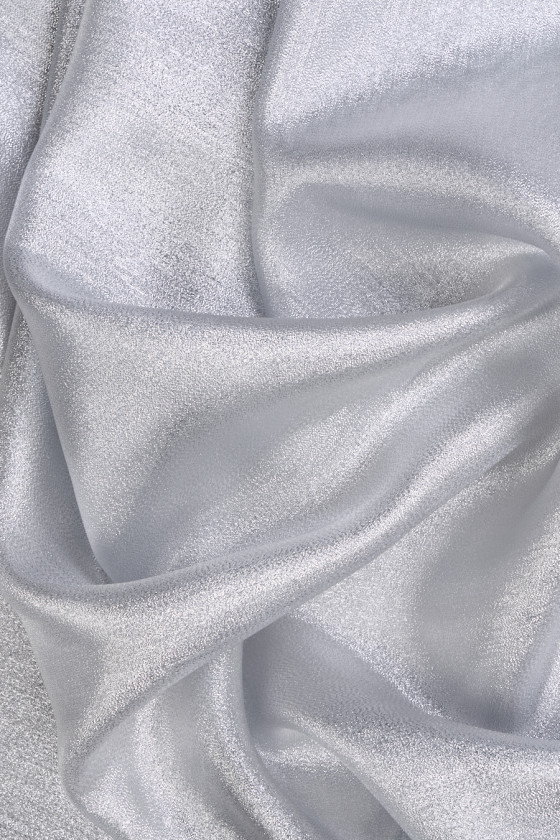 Itaalia polüester organza kangas hõbedases värvitoonis. Kangas on õhuke, kergelt läbipaistev, jäik ja intensiivne hõbedane sära. Ideaalne ettepanek luua ainulaadne õhtune riietus, nagu kleit, seelik ja dekoratiivne element.