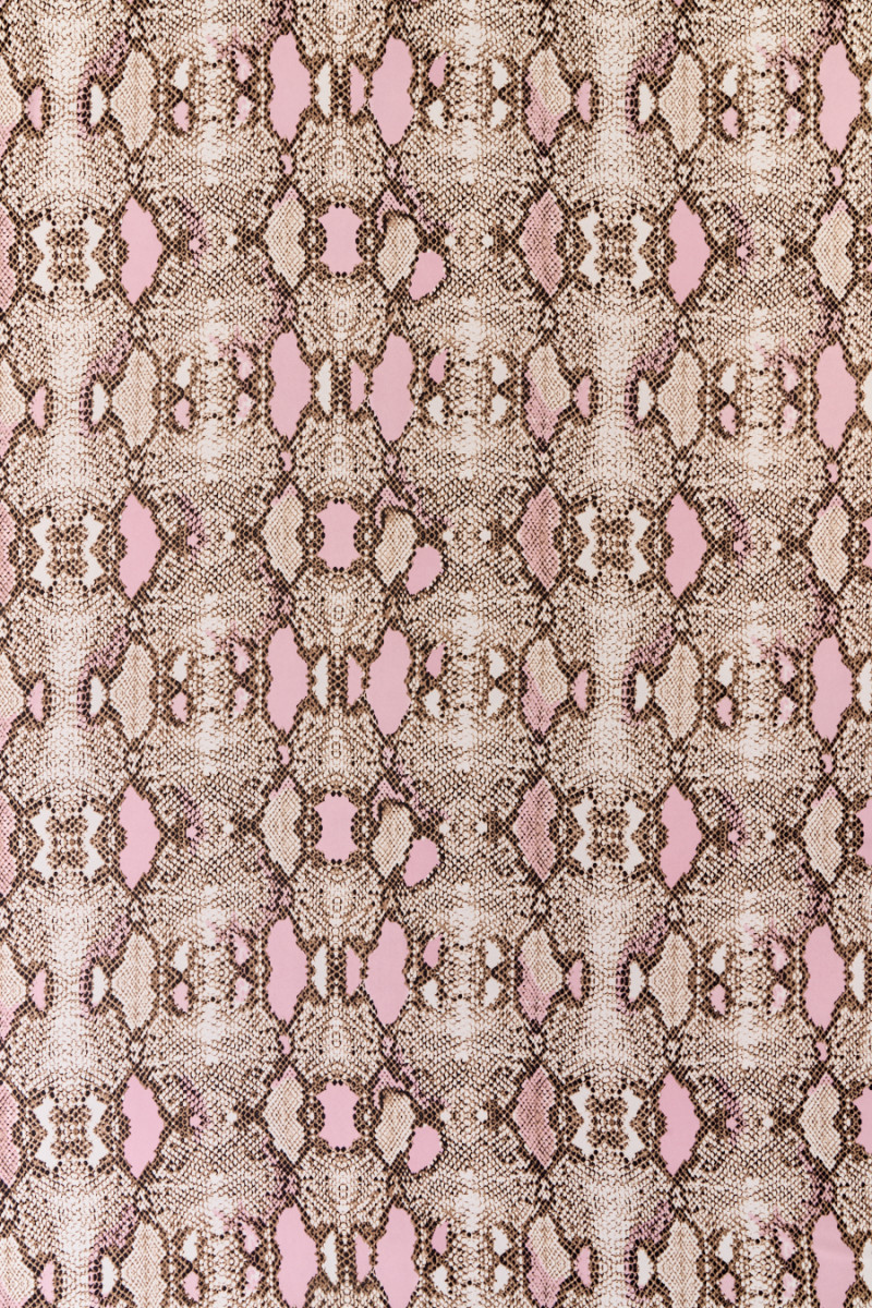 Itaalia polüester žoržett, millel on roosa taustaga suur maonaha motiiv beežis, pruun ja must. Teralise pinnaga kangas, õhuline, kergelt läbipaistev, kaetub kaunilt, voolavalt, elastselt. Ideaalne pakkumine ajatutes värvides loomamustrite austajatele. See sobib suurepäraselt õhulise kleidi, seeliku, pluusi ja särgi õmblemiseks.