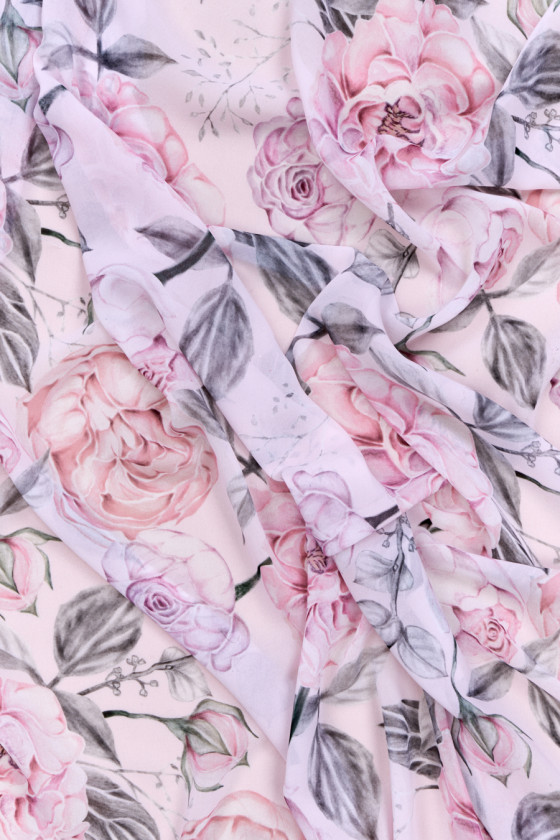 Itaalia polüester šifoon suurte pojengite motiiviga heleroosa taustal. Muster on valmistatud õrnades, pastelsetes toonides. Kangas on õhuline, kerge, läbipaistev, väga õrn ja meeldiv puudutada. Romantiline ettepanek inimestele, kellele meeldib lillekujundus. Kangas sobib suurepäraselt õhulise kleidi, seeliku, pluusi ja rätiku õmblemiseks.