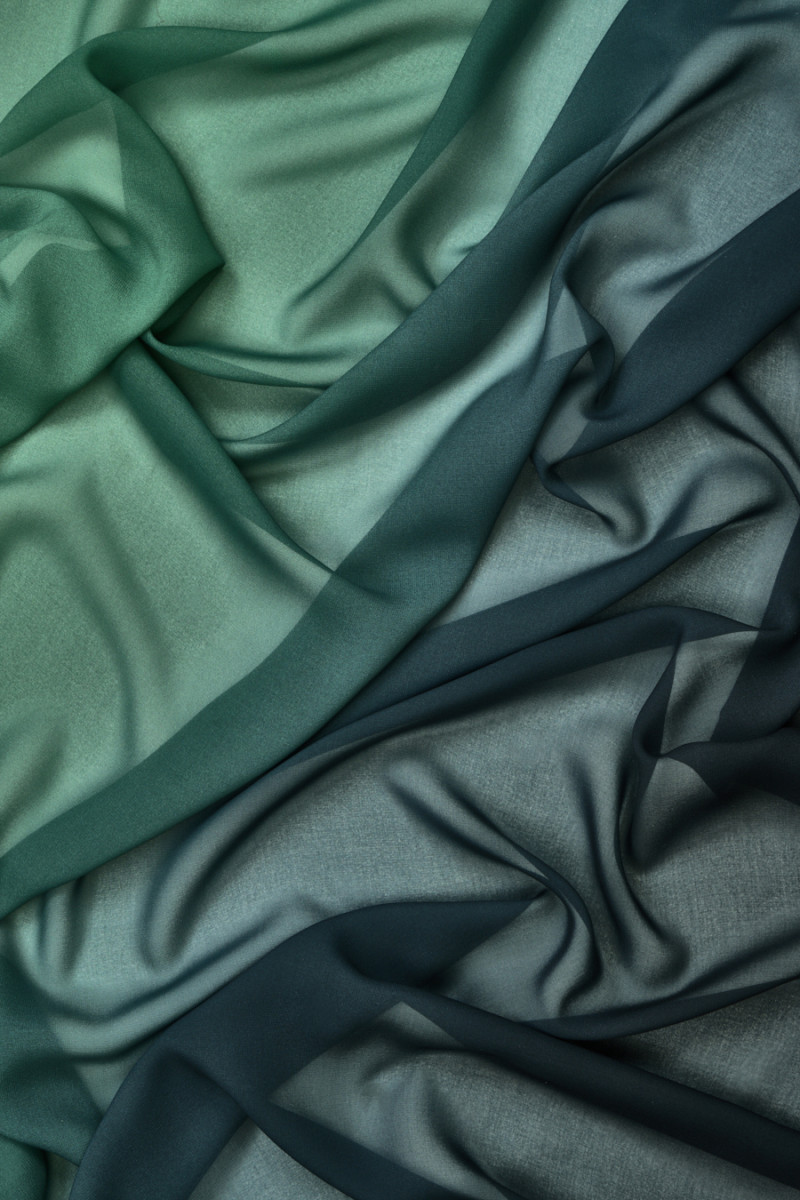 Ombre polüester šifoon rohelistes toonides. Muster ulatub kanga ühest servast sinisest, läbi roheliste toonide kuni grafiidini teises servas - soovitame õmmelda ringikujuliselt. Kangas on väga tuuline, kerge, voolav, kergelt läbipaistev ja elastne. Suurepärane pakkumine sügisvärvides, mis sobib hästi kleidi, seeliku, aga ka tuunika või särgi õmblemiseks.