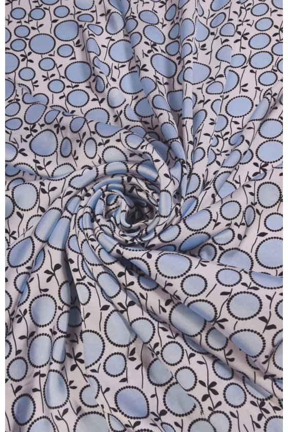 Tiheda mustriga polüestrist valmistatud satiin - ringid on 1,5-2,5 cm. Soovitame sellest õmmelda suvekleidid, pluusid ja seelikud. See ei ole läbinähtav, saate selle vooderdamata õmmelda. Grammage sobib ka naistesärkide õmblemiseks. Värvid: ecru taustal sinised ringid.