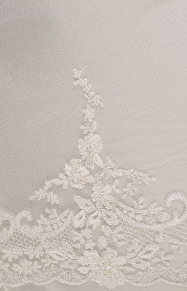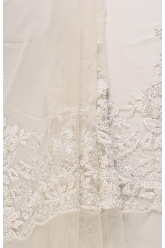 Ecru pits, ideaalne pulmarõivaste viimistlemiseks või korseti õmblemiseks, mustri kõrgus 12-30 cm. Kangas viimases kupongis 60*260cm, rikkalikult viimistletud helmeste ja pärlitega.