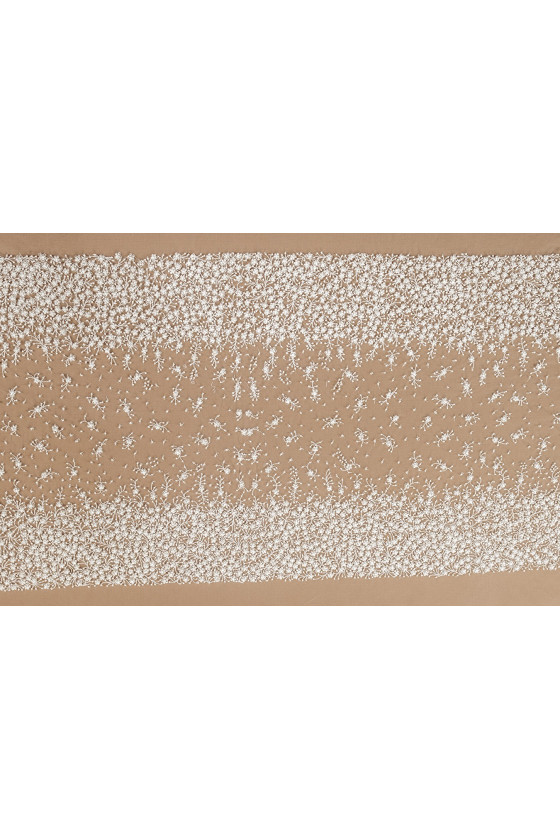 Itaalia pulmaaplikatsioon kreemika korseti kujul. Heledatest helmestest valmistatud väikeste lillede motiiv. Muster on keskelt hõre ja pakseneb servade suunas. Mõõdud: laius 110 cm, kõrgus 40 cm.