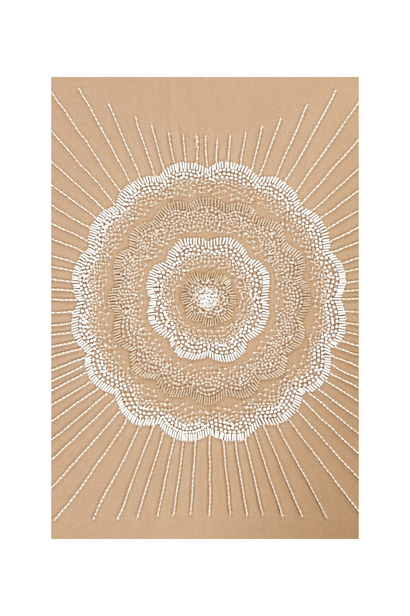 Itaalia pulmaaplikatsioon korseti kujul (pluus - ees) kreemikas värvitoonis. Väikesed läbipaistvad helmed loovad mustri, mis meenutab päikesekiiri. Aplikatsiooni keskel on suur lill (27 cm), mis on valmistatud valgetest litritest ja pärlitest ning läbipaistvatest helmestest. Kogu on õmmeldud pehmele tüllile. Rakendus sobib ideaalselt pulma- või õhtukleidi jaoks.
