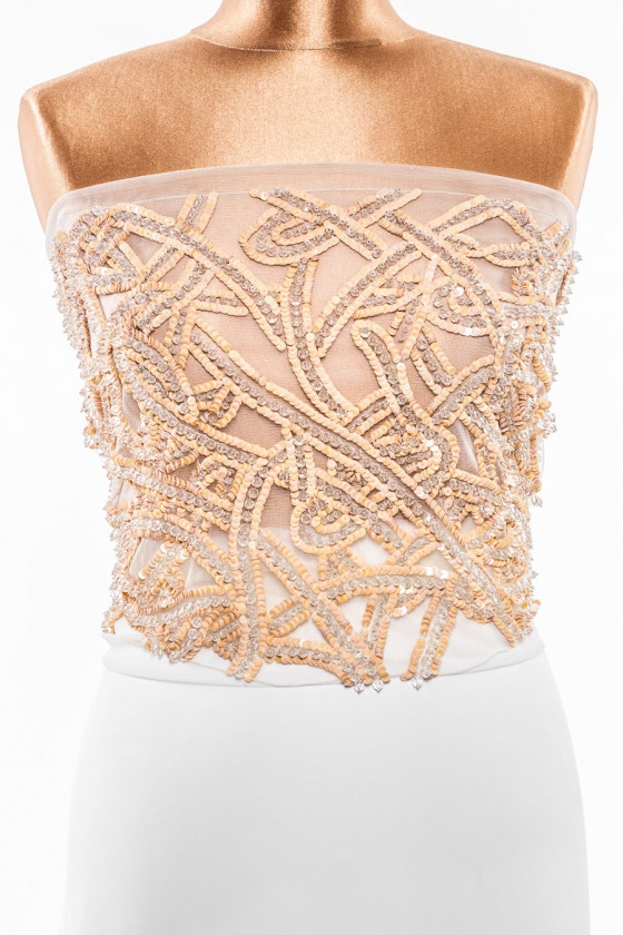Itaalia aplikatsioon korseti kujul (ees). Ilus, väljamõeldud muster, mis on valmistatud aprikoosivärvi litritest ja suurtest läbipaistvatest helmestest. Kogu on õmmeldud pehmele kreemikas tülli võrgule.
