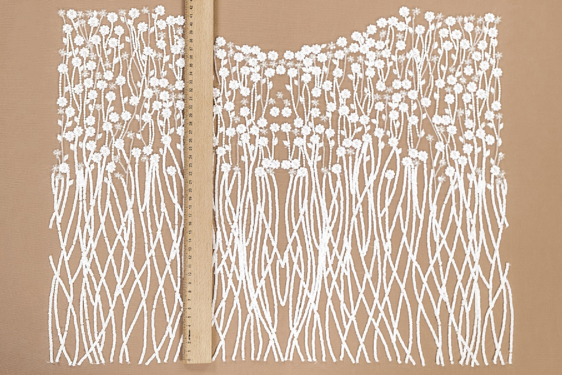 Itaalia aplikatsioon korseti kujul (pluus - ees) valge - tihedalt kaunistatud väikeste lilledega, mis on valmistatud valgetest ja läbipaistvatest helmestest ja litritest. Kogu on õmmeldud pehmele kreemikas tülli võrgule.