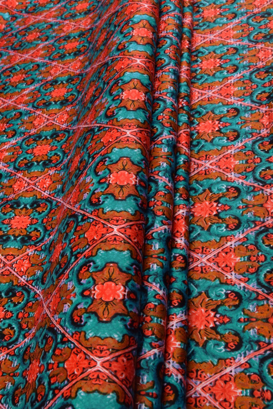 Värviline puuvill, kergelt elastne. Teemantidesse paigutatud dekoratiivne, värviline muster. Värvid: türkiissinine, pruun ja helepunane. Ettepanek suvekleitide, seelikute, pükste õmblemiseks