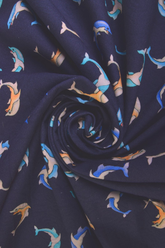 Paksem, tumesinine jacquard puuvill värviliste delfiinide trükiga (suurus ca 4 cm)