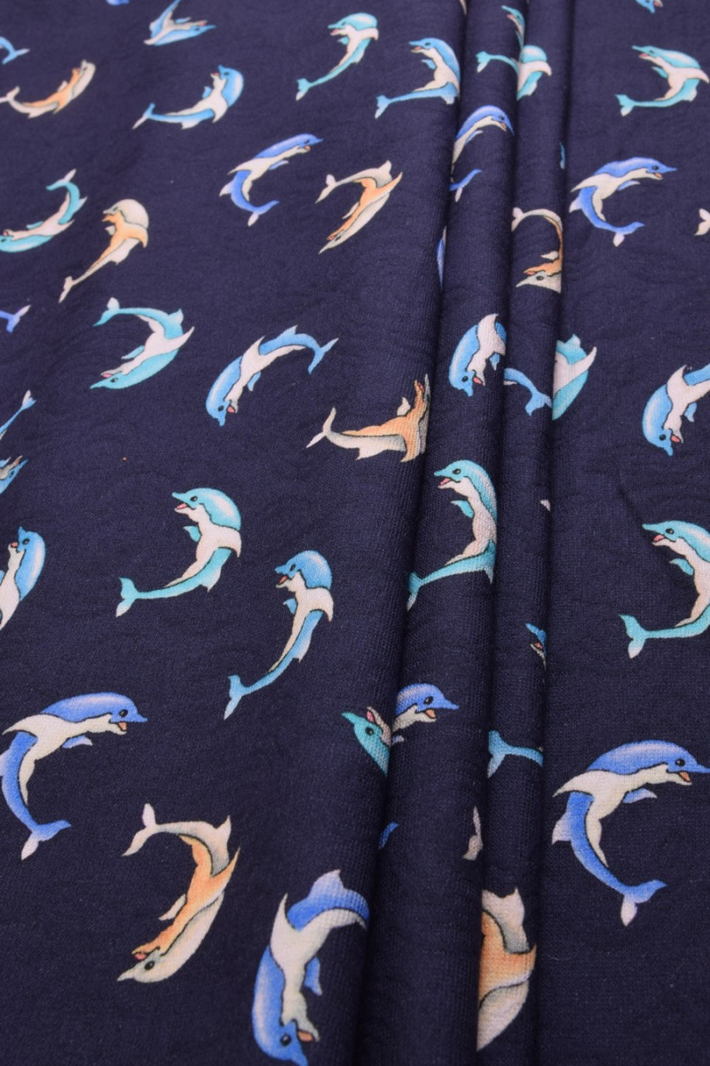 Paksem, mereväe sinine jacquard puuvill, millel on värvilised delfiinid (suurus umbes 4 cm). Soovitame seda kleitide, pükste, seelikute, jakkide õmblemiseks.