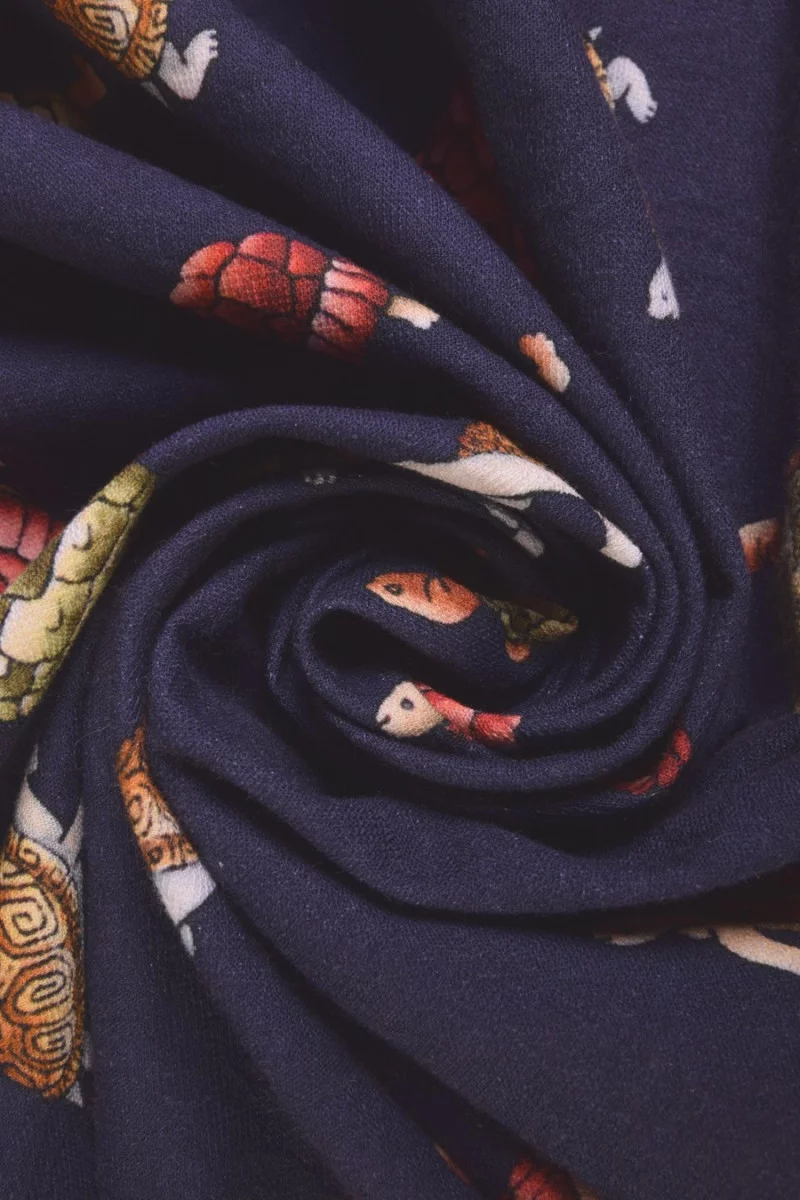 Paksem, mereväe sinine jacquard puuvill, millel on värvilised kilpkonnad (suurus umbes 3,5-4 cm).