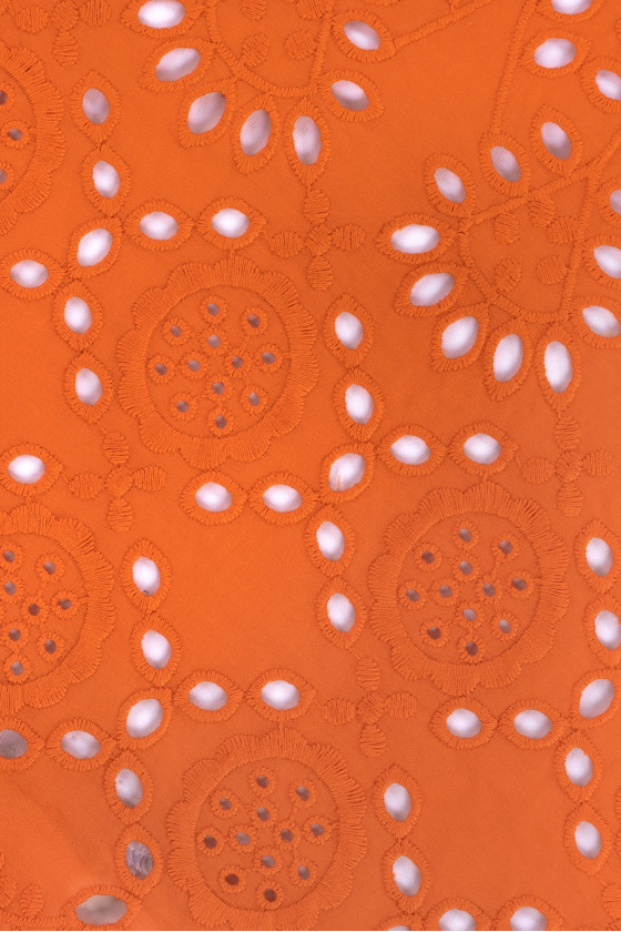 Itaalia puuvillane batiste kangas oranži värvi. Seledge'i ühel küljel oleval kangal on dekoratiivne richelieu tikand, mille laius on 40 cm - õmbleme selle ringikujuliselt. Kangas on õhuke, kergelt läbipaistev, elastne, väga hingav.