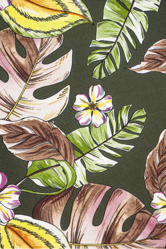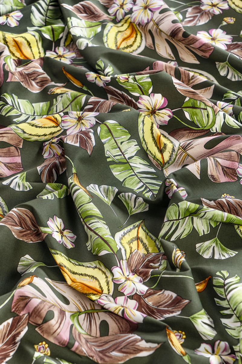 Itaalia puuvillane kangas khakis eksootiliste lehtede ja lillede motiiviga. Puuvill on 100% looduslik kiud. Puuvillased kangad on vastupidavad, ei kulu kiiresti, säilitavad oma omadused pikka aega, on täiesti hingavad, hingavad, mis annab suure kasutusmugavuse. Elastne, matt, läbipaistmatu kangas - sobib suurepäraselt kleidi, pükste, seeliku või lühikeste pükste õmblemiseks.