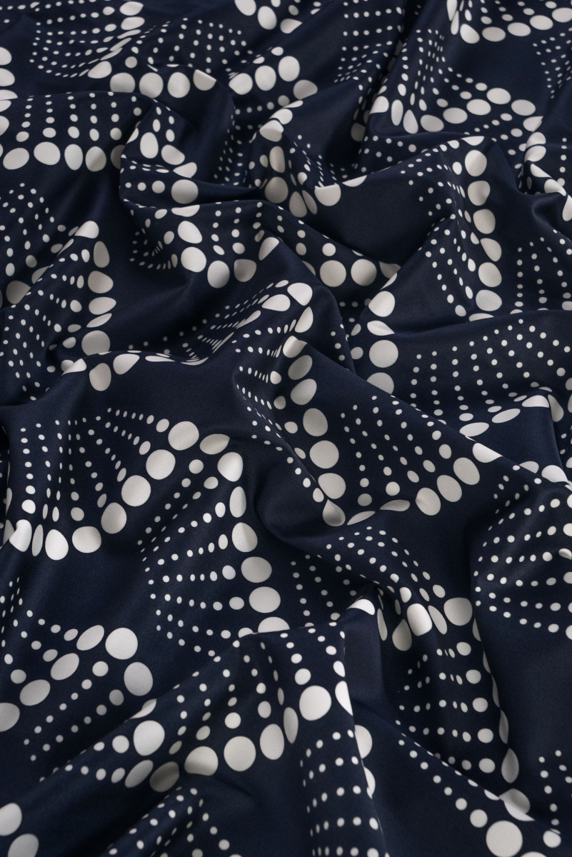 Itaalia puuvill elastne tume tumesinine, mille motiiv on ebakorrapäraste polka täppidega kreemikas. Puuvill on 100% looduslik kiud. Puuvillased kangad on vastupidavad, ei kulu kiiresti, säilitavad oma omadused pikka aega, on täiesti hingavad, hingavad, mis annab suure kasutusmugavuse. Kergelt elastne, matt, läbipaistmatu kangas - sobib suurepäraselt kleidi, pükste, seeliku või lühikeste pükste õmblemiseks.
