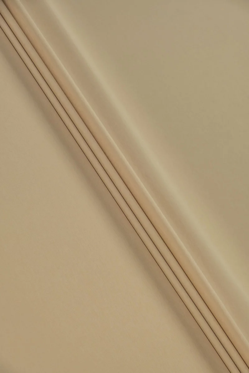 Itaalia puuvillane riie, millele on lisatud viskoosi ja elastaani beežina. Kangas on veidi jäik, ühel küljel on õrn satiinist kudumine. See venib väga hästi, nii et see sobib ideaalselt paigaldatud kleidi, seeliku või lühikeste pükste õmblemiseks. Looduslik koostis muudab selle suurepäraseks kangaks kevadeks ja suveks.