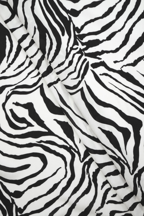 Itaalia 100% puuvillane kangas musta sebra motiiviga kreemikal taustal. Ajatu loomamuster klassikalistes värvides. Sileda koega kangas, õhuke, kergelt läbipaistev, õhuline ja mitteelastne. See sobib suurepäraselt pluuside, särkide, aga ka suvekleitide ja seelikute jaoks, mille jaoks soovitame kasutada voodrit.