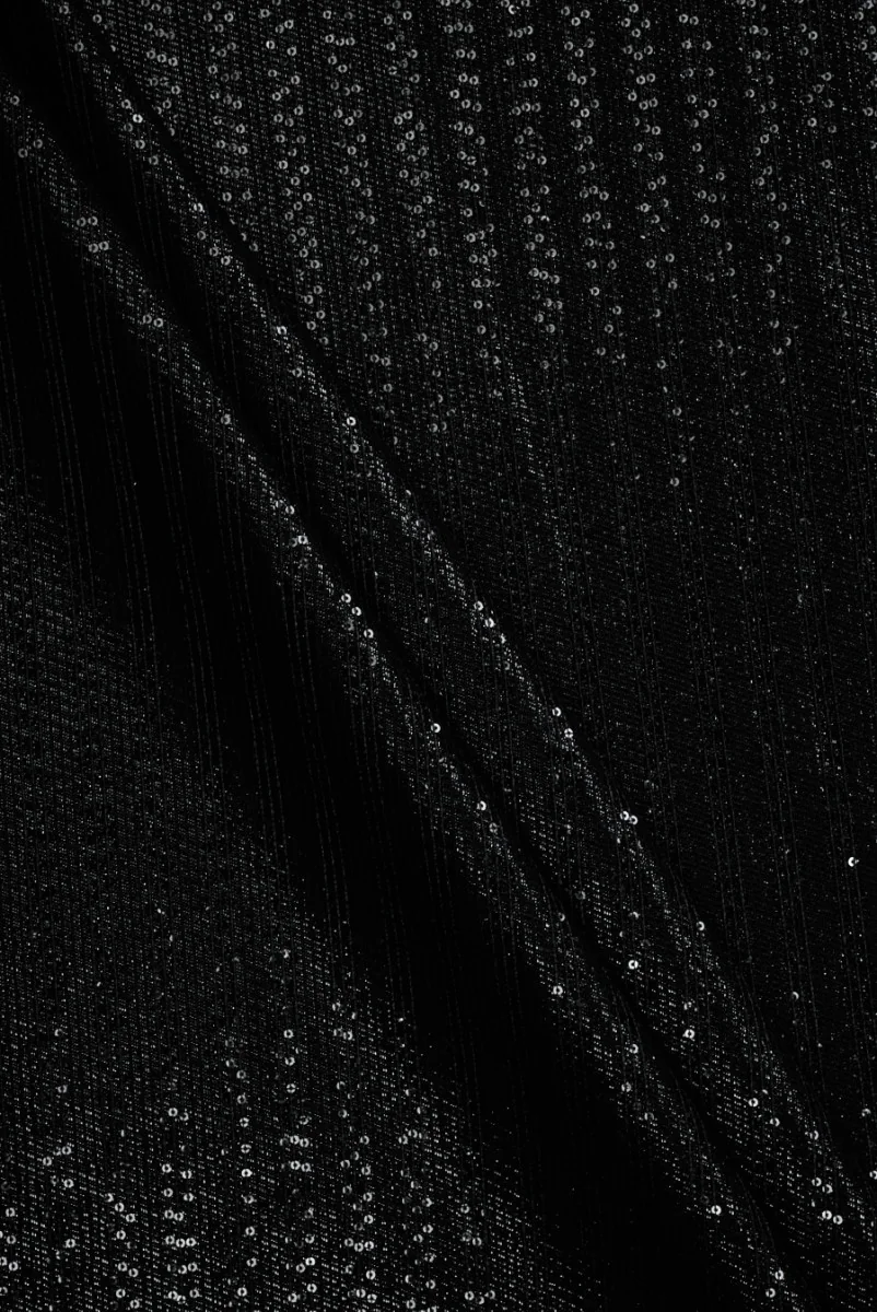 Jacquard-puuvillane kangas mustas, triibulise motiiviga litritega. Muster, mis kordub iga 1 cm tagant, koosneb kolmest niidist, mis asuvad üksteise lähedal kogu kanga laiuses, niitidesse on tihedalt põimitud väikesed mustad litrid. Kogu asi on õmmeldud musta, läikiva niidiga, mis annab kangale läike ja esmase ilme. Materjal on keskmise paksusega, paindumatu, paigutus on üsna jäik, kuid mitte liiga paks. Suurepärane lahendus, millest saab õmmelda jope, kleiti, seelikut või pükse.