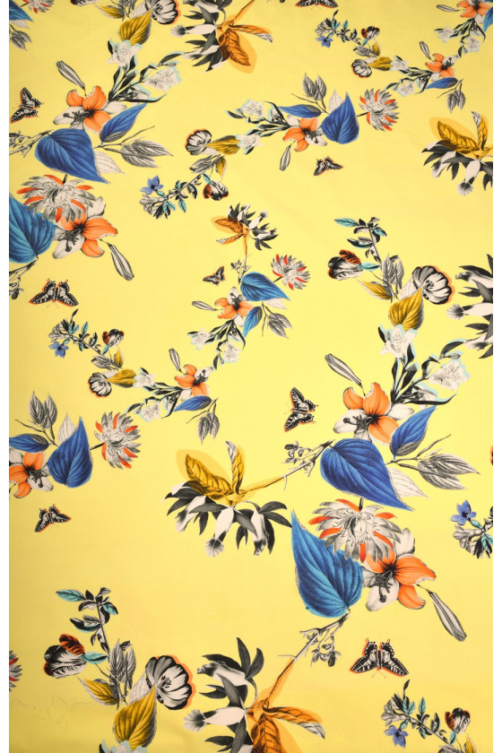 Puuvill elastne kollane õietrükiga. Soovitame seda sobivate kleitide, seelikute või pükste õmblemiseks.