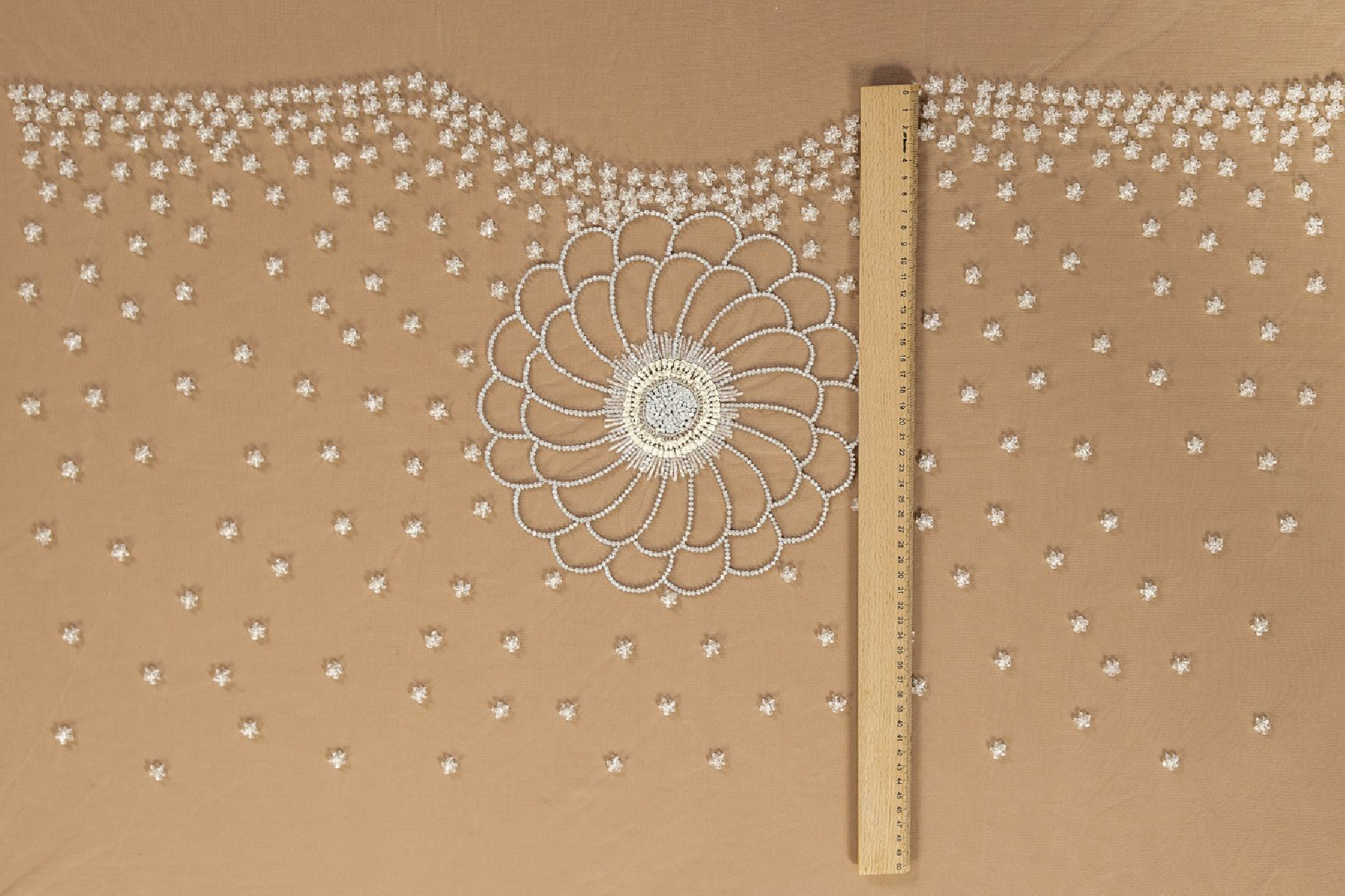 Itaalia pulmaaplikatsioon korseti kujul (pluus - ees). Kreemikas tüllis - aplikatsiooni keskele õmmeldi suur läbipaistvatest helmestest ja litritest valmistatud lill (24 cm) - lille keskosa oli tihedalt täidetud hõbedaste ja ekru helmeste ja litritega. Korseti ülemine osa on tihedalt kaunistatud väikeste läbipaistvate lilledega - muster väheneb allapoole. Rakendus sobib ideaalselt pulma- või õhtukleitide jaoks.
