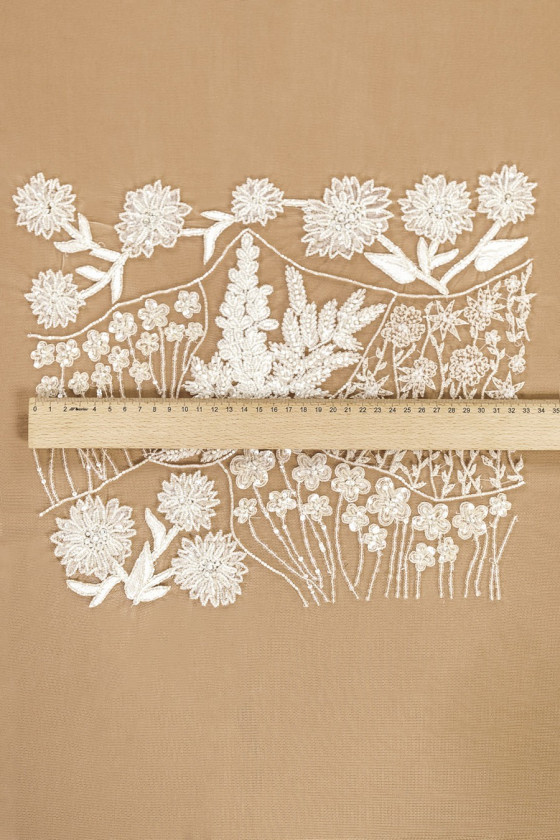 Itaalia, suur ecru pulmaaplikatsioon. Läbipaistvatest litritest ja helmestest ning tikitud lehtedest valmistatud erinevate lillede motiiv.