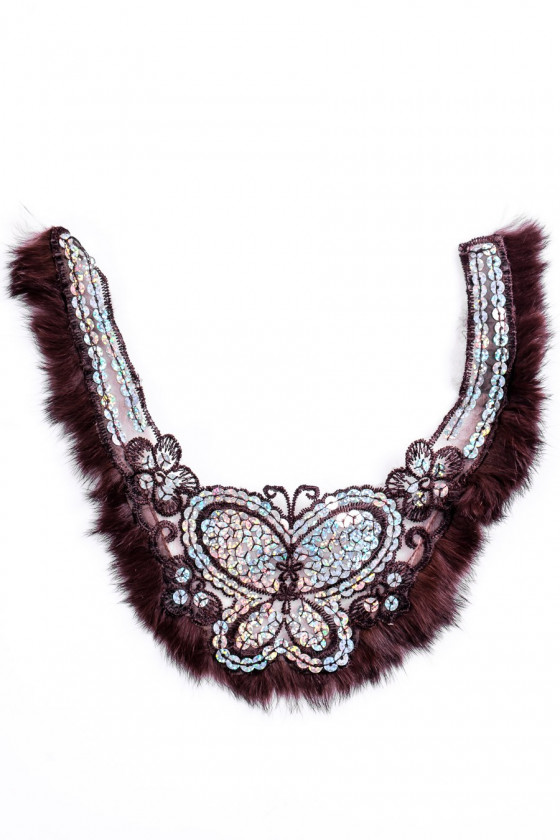 Butterfly kaelusega aplikatsioon - tikitud litritega naturaalse pruuni karusnahaga. Kõrgus 25 cm, laius 10 - 28 cm.