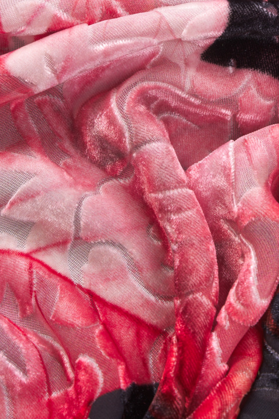 Itaalia viskoos-siid veluur devore tüüpi suurte punakas-roosade lehtedega varjutatud must-hall taustal, muster on ringikujuline. Devory kangas on kombinatsioon siledast, läbipaistvast siidist šifoonist, millel on läbipaistmatud, veluursed viskoosmustrid. Õhuke, läbipaistev, pehme ja mitteelastne kangas - ideaalne kleidi, pluusi või seeliku õmblemiseks.