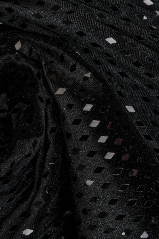 Elastne veluur mustas, kaunistatud väikeste, mustade ja läikivate teemantidega. Arvud on 4mm * 6mm suurused. Kangas on pehme, väga elastne ja läbipaistmatu. See sobib ideaalselt õhtu- ja peorõivaste, näiteks kleitide, seelikute, pükste või kostüümide õmblemiseks.
