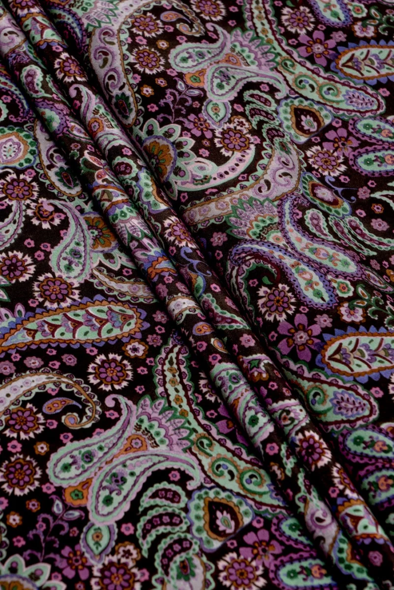 Elastne siidkrepp paisley mustriga, tuntud ka kui Türgi muster. Mustal taustal on oad lilla ja rohelise tooniga. See on õrn, õhuke, kuid läbipaistmatu matt kangas. Seda saab kasutada õhuliste kleitide, õrnade pluuside, sallide, sallide väljameelitamiseks.