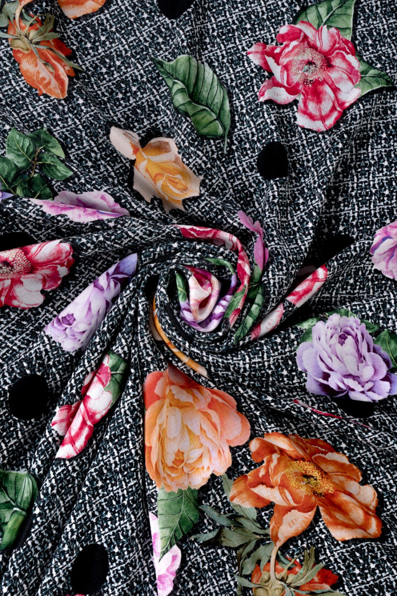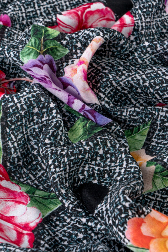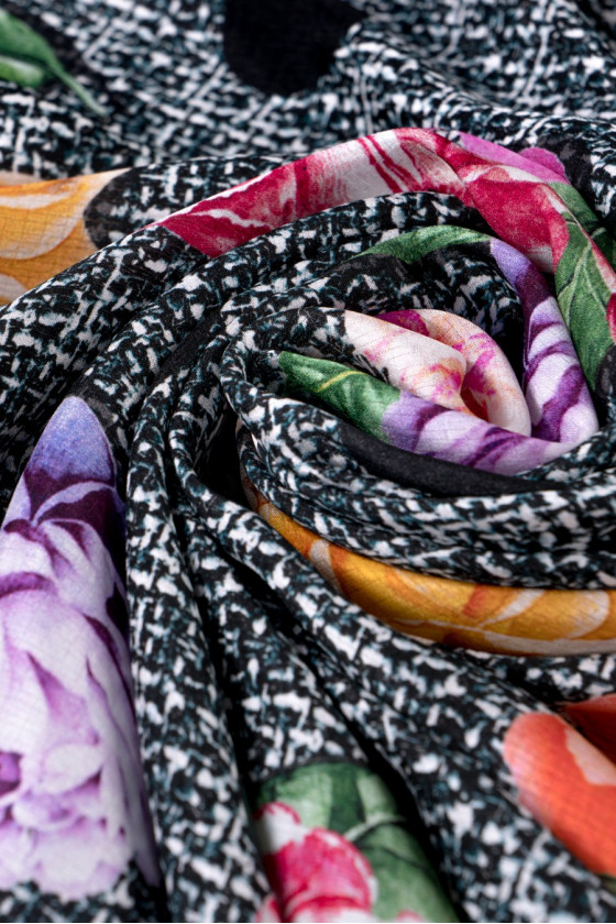 Jacquardi siid, millele on alla kirjutanud kuulsad moeloojad suurte värviliste lilledega valgel ja mustal taustal. Lillede suurus on umbes 10 cm. Kangas on 100% naturaalne, läbipaistmatu, väga õrna läikega, sobib ilusti. Soovitame sellest õmmelda elegantsed pluusid, kleidid, seelikud, tuunikad