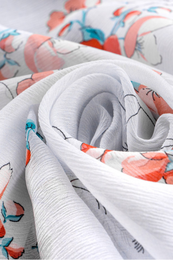 100% siidist šifoon tuntud moebrändilt, mis on kootud kergeks libisemiseks. Värvid: väga helesinisel taustal õrnade lillede trükk oranžis korallis ja türkiisis. Kangas on õhuke ja elastne, kergelt läbipaistev, väga õhuline. Soovitame seda suvekleitide, pluuside, tuunikate või pikkade seelikute jaoks.