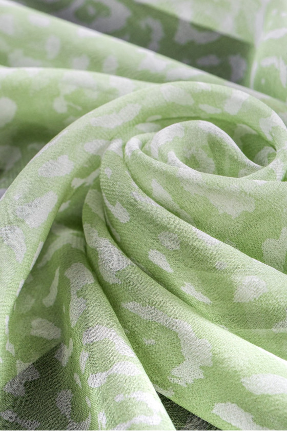 Siidist georgette rohelise pistaatsia värvi valge leoparditrükiga. See on matt, väga õrn, poolläbipaistev kangas (vajab vooderit).